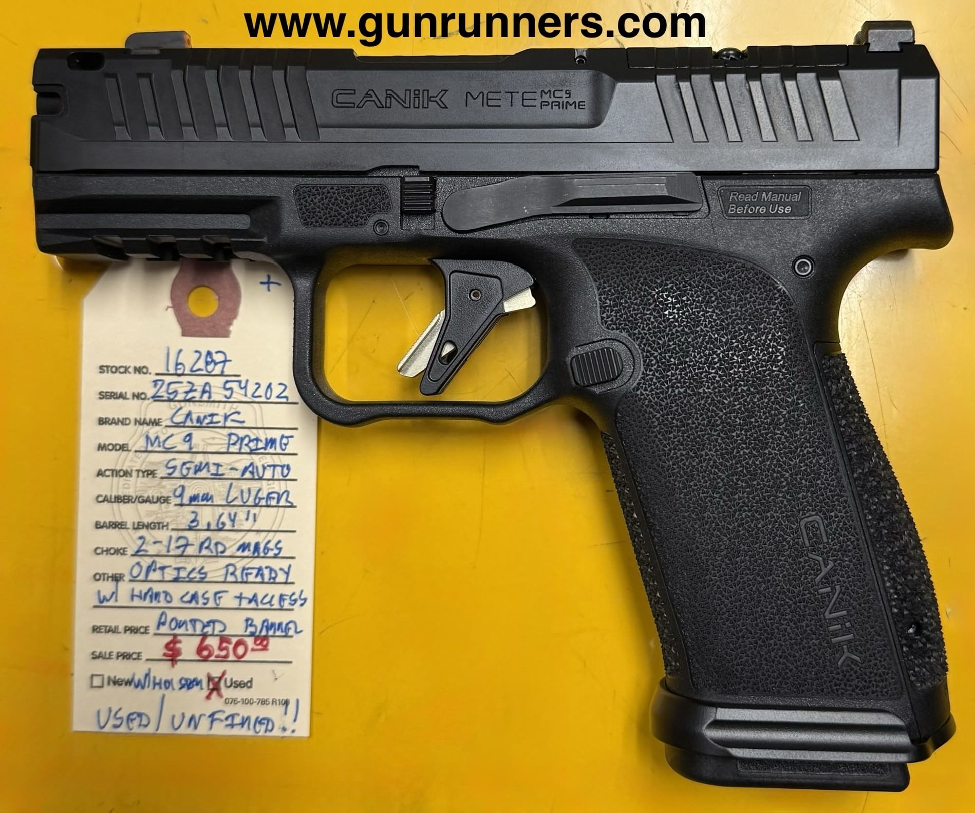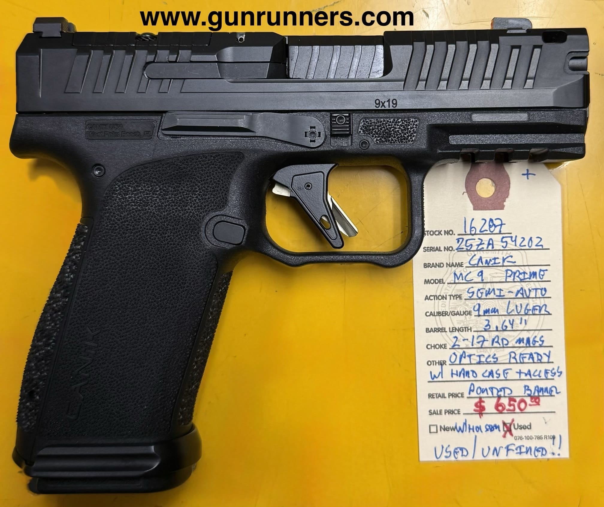 Home / Pistols / Semi Auto Pistols / Canik, used but unfired, METE MC9 Prime, 9mm Luger caliber, semi auto pistol, 3.64” ported barrel, optics ready, tritium sights, with holster, with box and all factory accessories. Canik, used but unfired, METE MC9 Prime, 9mm Luger caliber, semi auto pistol, 3.64” ported barrel, optics ready, tritium sights, with holster, with box and all factory accessories.$650.00 Canik, used but unfired, METE MC9 Prime, 9mm Luger caliber, semi auto pistol, 3.64” ported barrel, optics ready, tritium sights, with holster, with box and all factory accessories. quantity Add to cart SKU: 16287 G/R Category: Semi Auto Pistols Tags: 3.64” ported barrel, 9mm Luger caliber, Canik, holster, METE MC9 Prime, optics ready, semi auto pistol, slim-n-trim, tritium sights, used but unfired, with box and all accessories. Product ID: 21680 Description Description This compact and awesome blaster is available at the NORTHERN LIGHTS STORE. Please call 907-245-5486 for additional information. Related products Colt Series 80 1911 45acp $899.00 Add to cart Glock 43 9mm $499.00 Add to cart Springfield SA 35 9mm $899.00 Add to cart Taurus 709 slim 9mm $299.00 Add to cart