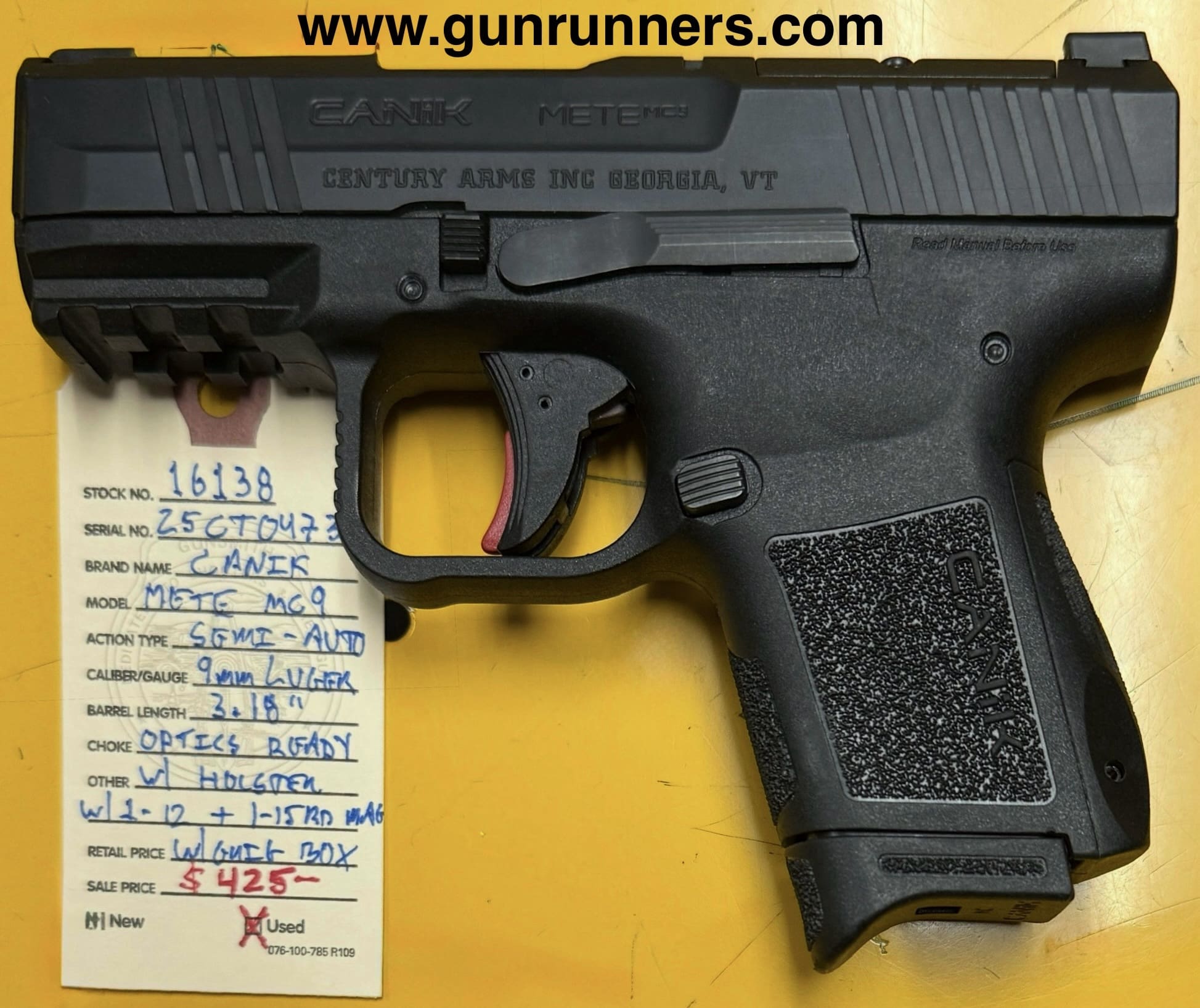Home / Pistols / Semi Auto Pistols / Canik, used, model Mete MC9, semi-auto pistol, 9mm Luger caliber, 3.18” barrel, optics ready, factory R/H holster, 1-12 and 1-15 round magazine, with original box and accessories. This pistol is in excellent condition. Canik, used, model Mete MC9, semi-auto pistol, 9mm Luger caliber, 3.18” barrel, optics ready, factory R/H holster, 1-12 and 1-15 round magazine, with original box and accessories. This pistol is in excellent condition.$425.00 Canik, used, model Mete MC9, semi-auto pistol, 9mm Luger caliber, 3.18” barrel, optics ready, factory R/H holster, 1-12 and 1-15 round magazine, with original box and accessories. This pistol is in excellent condition. quantity Add to cart SKU: 16138 G/R Category: Semi Auto Pistols Tags: 3.18” barrel, 9mm Luger caliber, Canik, factory holster, Mete MC9, optics ready, original box and accessories., semi-auto pistol, used, w/1-12 and 1-15 round magazine Product ID: 20904 Description Description This “slim-n- trim” compact blaster is available at the NORTHERN LIGHTS STORE. Please call 907-276-8105 for additional information. Related products SALE!! Glock Model 37, .45 GAP caliber, Gen. 3, semi-auto pistol, 4.49” barrel, w/10 round magazine. $599.00 Add to cart Hi Point C9 9 mm $229.00 Add to cart Sig Sauer M17X 9 mm $1,400.00 Add to cart Colt government model 1911 45acp $1,199.00 Add to cart