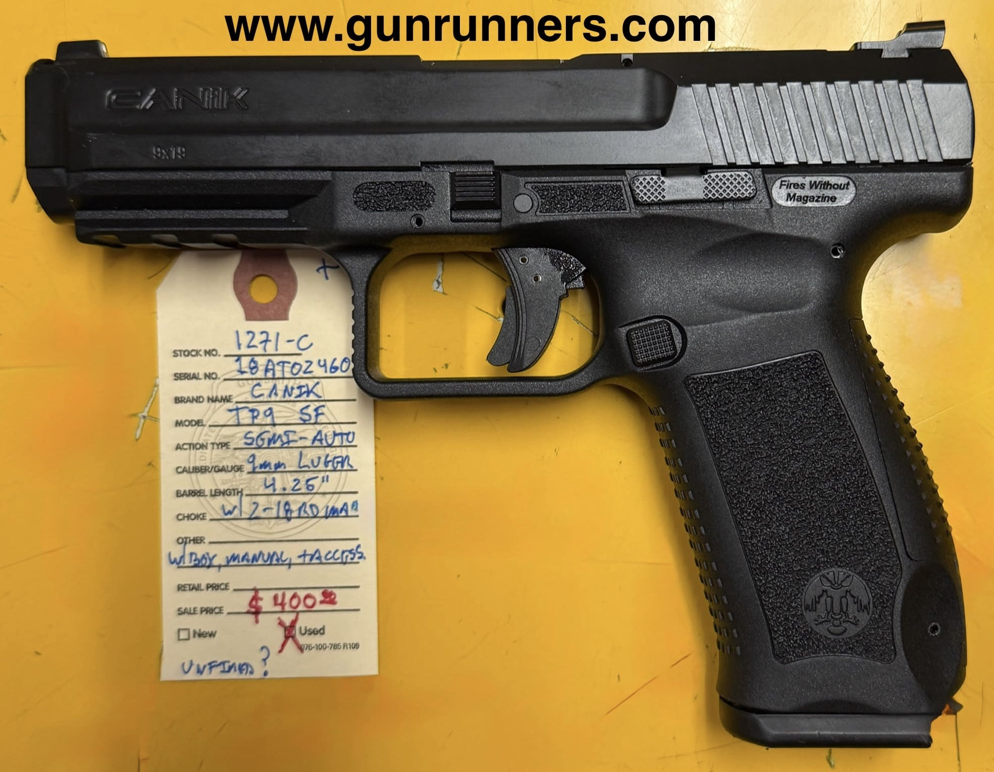 Home / Pistols / Semi Auto Pistols / Canik, used/unfired?, TP9 SF, 9mm Luger caliber, striker fired, semi auto pistol, 4.25” barrel, 2-18 round magazines, with original box and accessories. Canik, used/unfired?, TP9 SF, 9mm Luger caliber, striker fired, semi auto pistol, 4.25” barrel, 2-18 round magazines, with original box and accessories.$400.00 Canik, used/unfired?, TP9 SF, 9mm Luger caliber, striker fired, semi auto pistol, 4.25” barrel, 2-18 round magazines, with original box and accessories. quantity Add to cart SKU: 1271-C G/R Category: Semi Auto Pistols Tags: 2-18 round magazines, 4.25” barrel, 9mm Luger caliber, Canik, semi auto pistol, TP9 SF, used/unfired?, with original box. Product ID: 21456 Description Description This striker fired pistol is available at the NORTHERN LIGHTS STORE. Please call 907-276-8105 for additional information. Related products Hi Point C9 9 mm $229.00 Add to cart HK VP 40 40 S&W $700.00 Add to cart Colt government model 1911 45acp $1,199.00 Add to cart Glock 43 9mm $499.00 Add to cart
