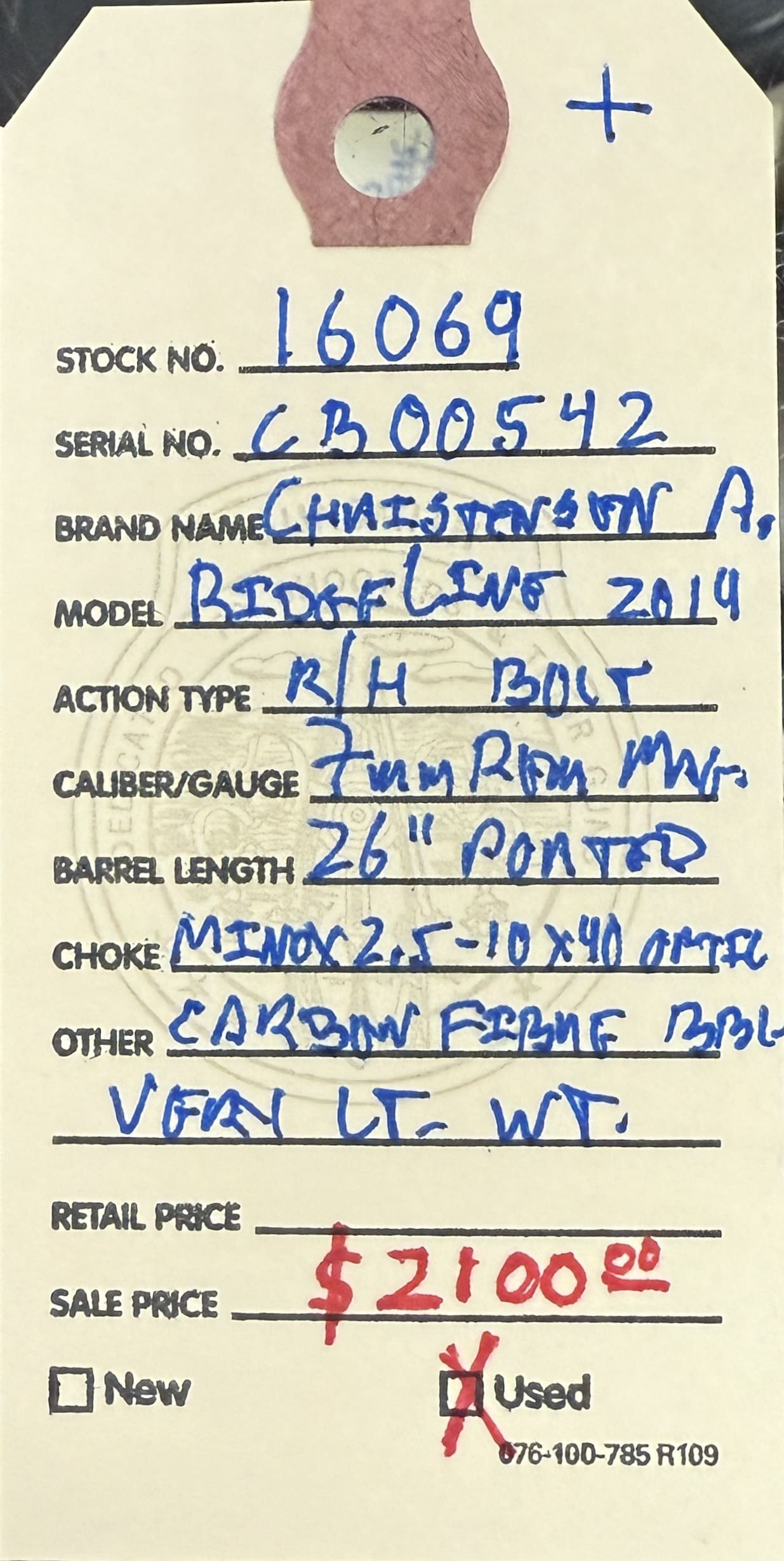 Home / Rifles / Bolt Action Rifles / Christensen Arms, used, Model 2014 Ridgeline Titanium, light weight, 7mm Remington Magnum caliber, right hand bolt action rifle, 26” ported carbon fiber barrel, w/Minox 2.5-10X40mm telescopic sight. Christensen Arms, used, Model 2014 Ridgeline Titanium, light weight, 7mm Remington Magnum caliber, right hand bolt action rifle, 26” ported carbon fiber barrel, w/Minox 2.5-10X40mm telescopic sight.$2,100.00 Christensen Arms, used, Model 2014 Ridgeline Titanium, light weight, 7mm Remington Magnum caliber, right hand bolt action rifle, 26” ported carbon fiber barrel, w/Minox 2.5-10X40mm telescopic sight. quantity Add to cart SKU: 16069 G/R Category: Bolt Action Rifles Tags: 26” ported carbon fiber barrel, 7mm Remington Magnum caliber, Christensen Arms, light weight, Model 2014 Ridgeline Titanium, right hand bolt action, used, w/Minox 2.5-10X40mm telescopic sight. Product ID: 20567 Description Description This beautiful Alaskan hunting rifle is available at the NORTHERN LIGHTS STORE. Please call 907-276-8105 for additional information. Related products SALE! Springfield Armory, (used) Model 2020 Waypoint, 6.5PRC caliber, light weight, (under 7#), Ridgeline camouflage carbon fiber stock, and 24” carbon fiber wrapped barrel. Accuracy guarantee of 0.75” or less @ 100 yards. $1,999.00 Add to cart Ruger American 204 Ruger $469.00 Add to cart Ruger, American 22 lr $299.00 Add to cart Remington 722 Custom, 7.82 patriot $1,099.00 Add to cart