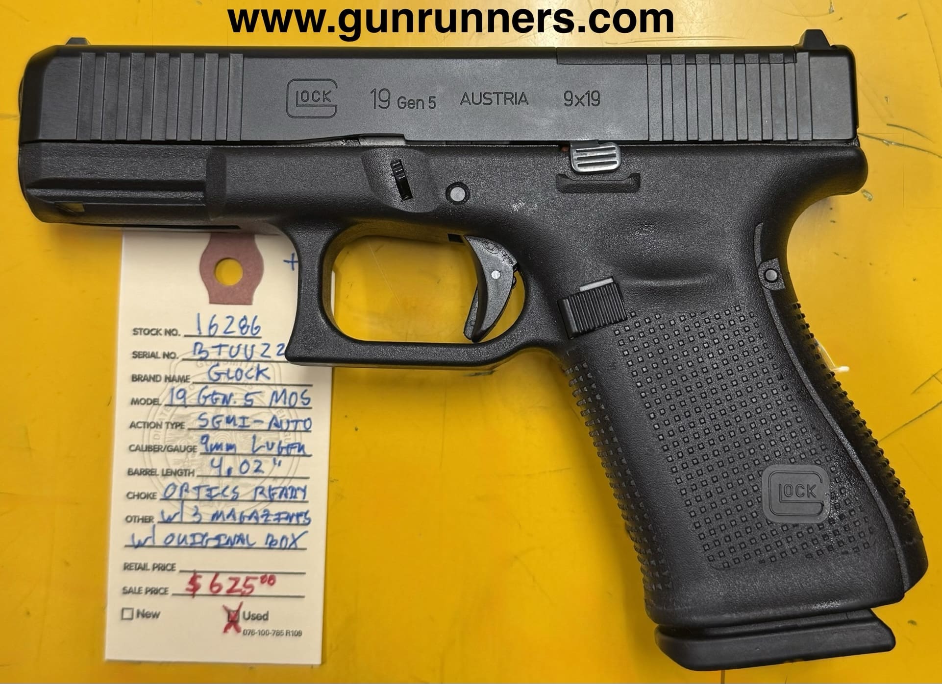 Home / Pistols / Semi Auto Pistols / Glock, used, Model 19 Gen. 5 MOS, 9mm Luger caliber, semi auto pistol, optics ready, 4.02” barrel, 3-15 round magazines, with original box and manual. Glock, used, Model 19 Gen. 5 MOS, 9mm Luger caliber, semi auto pistol, optics ready, 4.02” barrel, 3-15 round magazines, with original box and manual.$625.00 Glock, used, Model 19 Gen. 5 MOS, 9mm Luger caliber, semi auto pistol, optics ready, 4.02” barrel, 3-15 round magazines, with original box and manual. quantity Add to cart SKU: 16286 G/R Category: Semi Auto Pistols Tags: 3-15 round magazines, 4.02” barrel, 9mm Luger caliber, Glock, Model 19 Gen. 5 MOS, optics ready, semi auto pistol, used, with original box and papers. Product ID: 21676 Description Description This super popular pistol is available at the NORTHERN LIGHTS STORE. Please call 907-245-5486 for additional information. Related products Stoger American Eagle 22 Lr Luger $999.00 Add to cart Glock 23 GEN three with night sights 40S&w Read more Colt Series 80 1911 45acp $899.00 Add to cart Glock 43 9mm $499.00 Add to cart