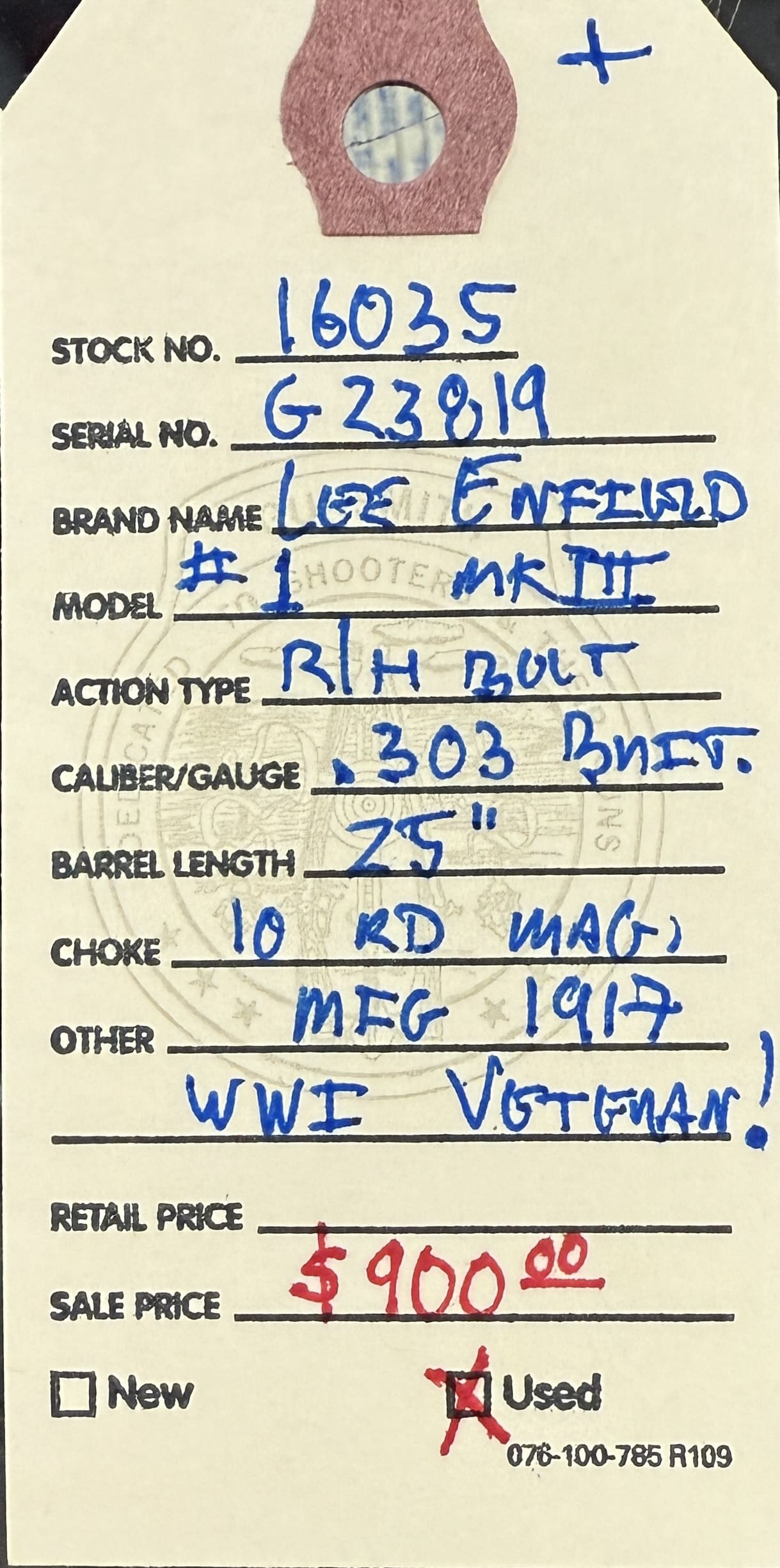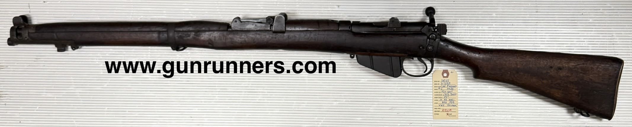 Home / Rifles / Bolt Action Rifles / Lee-Enfield, #1 MKIII, .303 British caliber, 25” barrel, 10 round magazine, manufactured in 1917. Imagine the stories this old rifle could tell! Lee-Enfield, #1 MKIII, .303 British caliber, 25” barrel, 10 round magazine, manufactured in 1917. Imagine the stories this old rifle could tell!$900.00 Lee-Enfield, #1 MKIII, .303 British caliber, 25” barrel, 10 round magazine, manufactured in 1917. Imagine the stories this old rifle could tell! quantity Add to cart SKU: 16035 G/R Category: Bolt Action Rifles Tags: .303 British caliber, #1 MKIII, 10 round magazine, 25” barrel, Lee-Enfield, wood/patina Product ID: 20345 Description Description This WWI veteran is available for your collection at the NORTHERN LIGHTS STORE. Please call 907-276-8105 for additional information. Related products Winchester model, 70 300 Win mag $599.00 Add to cart Ruger, American predator in 762×39 $659.00 Add to cart Ruger, American predator 6.5 CM $599.00 Add to cart SALE! Springfield Armory, (used) Model 2020 Waypoint, 6.5PRC caliber, light weight, (under 7#), Ridgeline camouflage carbon fiber stock, and 24” carbon fiber wrapped barrel. Accuracy guarantee of 0.75” or less @ 100 yards. $1,999.00 Add to cart
