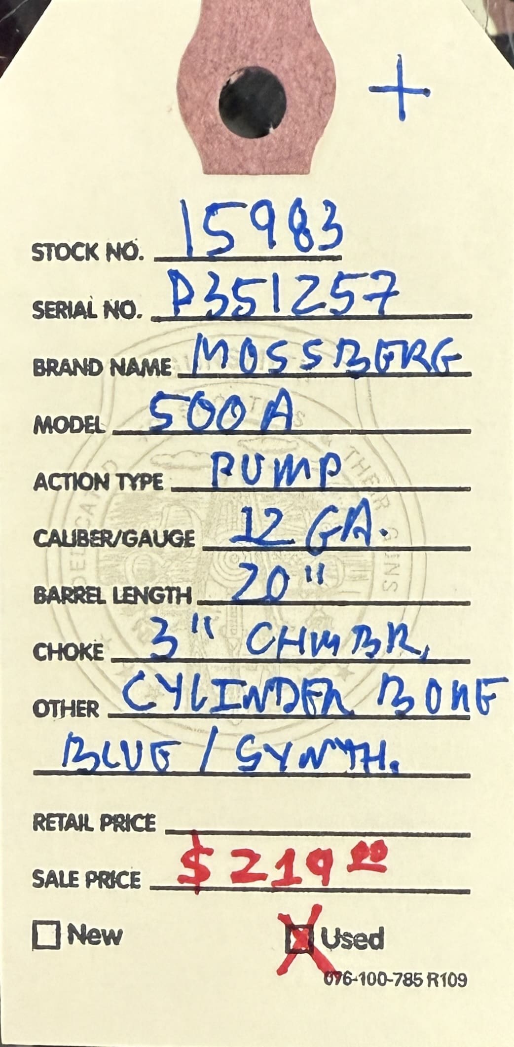 Home / Shotguns / Pump Action Shotguns / Mossberg, used, Model 500A, pump-action shotgun, 12 gauge, 3” chamber, 20” barrel, cylinder bore, blue/synthetic. Ready for some new adventures! Mossberg, used, Model 500A, pump-action shotgun, 12 gauge, 3” chamber, 20” barrel, cylinder bore, blue/synthetic. Ready for some new adventures!$219.00 Mossberg, used, Model 500A, pump-action shotgun, 12 gauge, 3” chamber, 20” barrel, cylinder bore, blue/synthetic. Ready for some new adventures! quantity Add to cart SKU: 15983 G/R Category: Pump Action Shotguns Tags: 12 gauge, 20” barrel, 3” chamber, cylinder bore., Model 500A, Mossberg, pump-action shotgun, used Product ID: 20229 Description Description This blaster is available at the NORTHERN LIGHTS STORE. Please call 907-276-8105 for additional information. Related products Kel Tec KS7 Green 12ga $699.00 Add to cart Winchester model, 12 $3,000.00 Add to cart Kel Tec KSG 12ga $915.00 Add to cart Escort pump 12 gauge $299.00 Add to cart