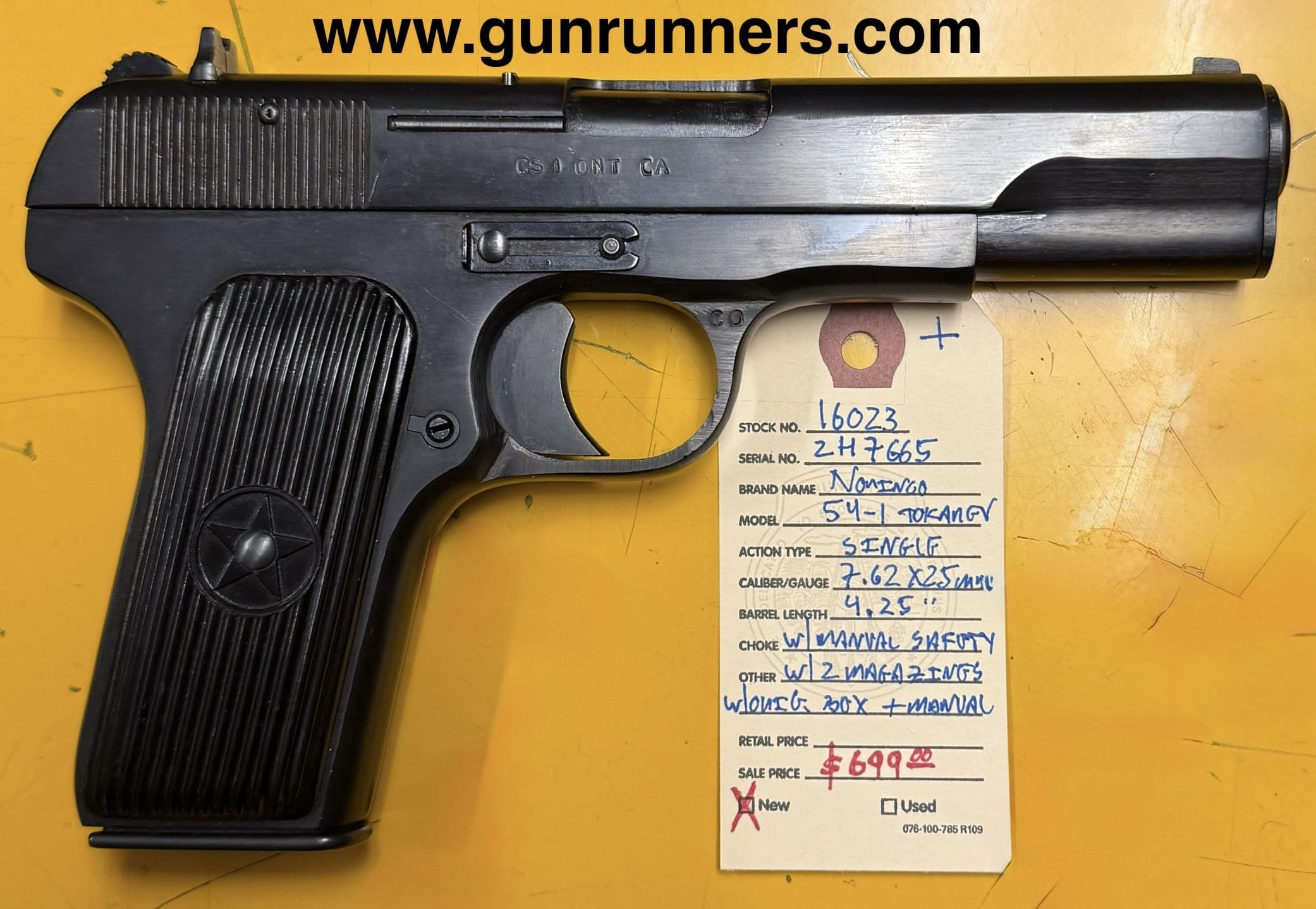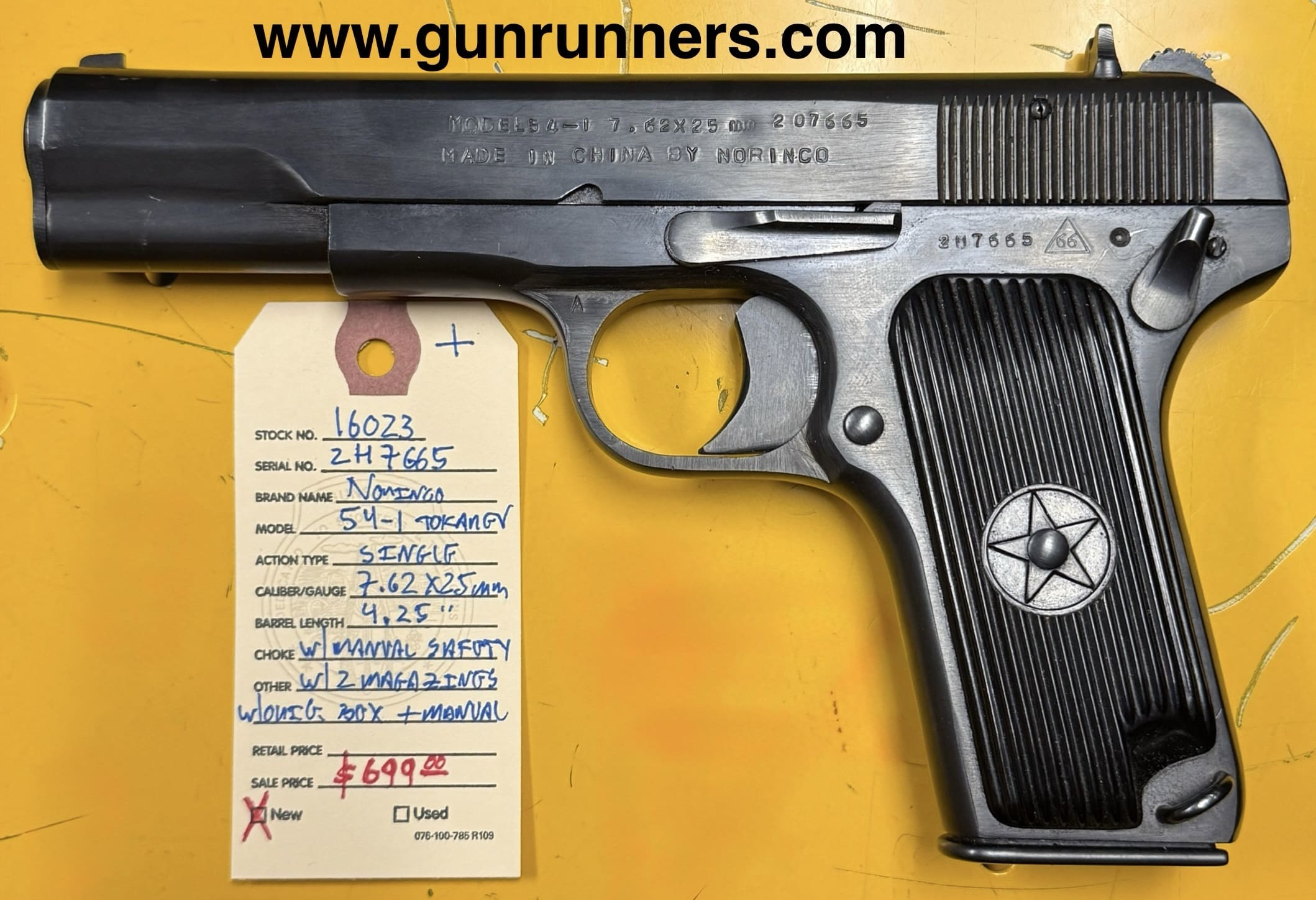 Home / Pistols / Semi Auto Pistols / Norinco (China), Model 54-1 Tokarev, 7.62 X 25mm caliber, single action semi-auto pistol, blued finish, 4.25” barrel, manual safety, 2 magazines, new w/box and accessories. Norinco (China), Model 54-1 Tokarev, 7.62 X 25mm caliber, single action semi-auto pistol, blued finish, 4.25” barrel, manual safety, 2 magazines, new w/box and accessories.$699.00 Norinco (China), Model 54-1 Tokarev, 7.62 X 25mm caliber, single action semi-auto pistol, blued finish, 4.25” barrel, manual safety, 2 magazines, new w/box and accessories. quantity Add to cart SKU: 16023 G/R Category: Semi Auto Pistols Tags: 4.25” barrel, 7.62 X 25mm caliber, blued finish, manual safety, Model 54-1, new w/box and accessories., Norinco (China), single action semi-auto pistol, Tokarev, w/2 magazines Product ID: 20423 Description Description This historic pistol is available at the NORTHERN LIGHTS STORE. Please call 907-276-8105 for additional information. Related products Glock 23 GEN three with night sights 40S&w Read more Hi Point C9 9 mm $229.00 Add to cart Glock 22 3rd gen 40S&W $499.00 Add to cart Kimber Classic custom 45acp $699.00 Add to cart