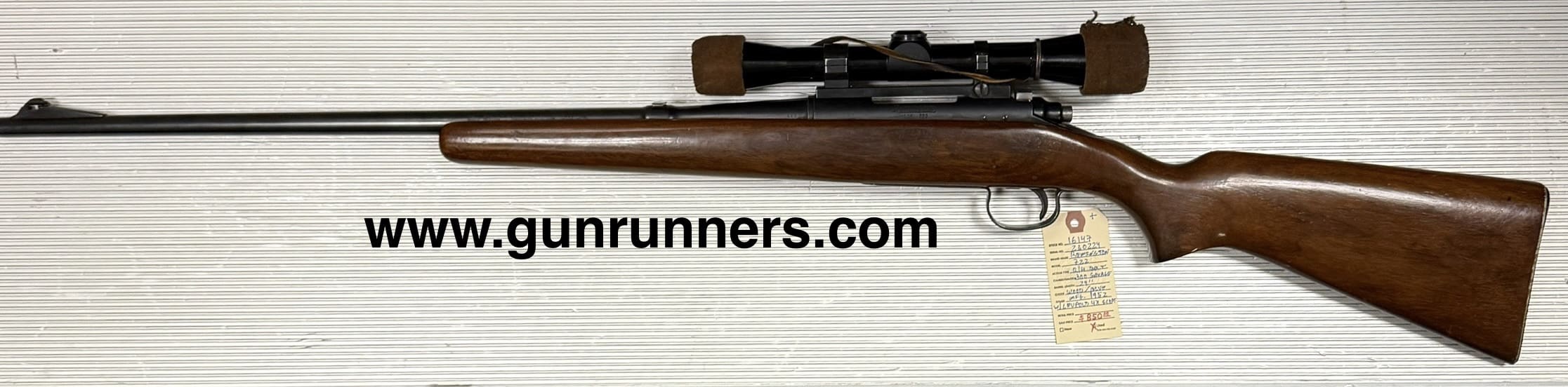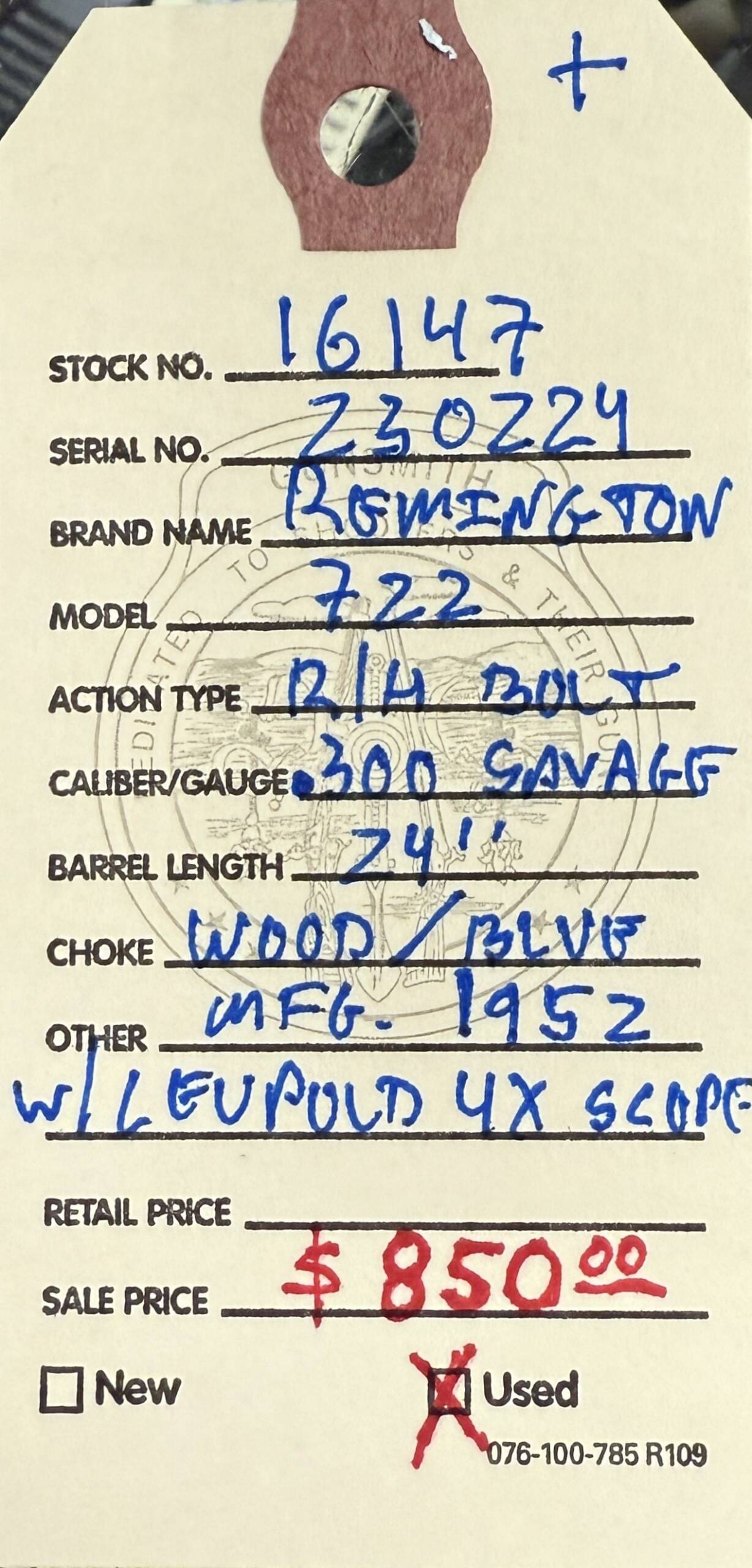 Home / Rifles / Bolt Action Rifles / Remington Model 722, used, .300 Savage caliber, right hand bolt action, 24” barrel, wood/blue, w/Leupold 4X telescopic sight, manufactured in 1952 and in very good condition. Remington Model 722, used, .300 Savage caliber, right hand bolt action, 24” barrel, wood/blue, w/Leupold 4X telescopic sight, manufactured in 1952 and in very good condition.$850.00 Remington Model 722, used, .300 Savage caliber, right hand bolt action, 24” barrel, wood/blue, w/Leupold 4X telescopic sight, manufactured in 1952 and in very good condition. quantity Add to cart SKU: 16147 G/R Category: Bolt Action Rifles Tags: .300 Savage caliber, 24” barrel, manufactured in 1952., Remington 722, right hand bolt-action rifle, used, w/Leupold 4X telescopic sight, wood/blue Product ID: 20916 Description Description This beautiful, classic, legendary, old rifle is available at the NORTHERN LIGHTS STORE. Please call 907-276-8105 for additional information. Related products Ruger American 204 Ruger $469.00 Add to cart Browning T Bolt 17hmr $999.00 Add to cart SALE! Springfield Armory, (used) Model 2020 Waypoint, 6.5PRC caliber, light weight, (under 7#), Ridgeline camouflage carbon fiber stock, and 24” carbon fiber wrapped barrel. Accuracy guarantee of 0.75” or less @ 100 yards. $1,999.00 Add to cart Savage 110 223 $499.00 Add to cart