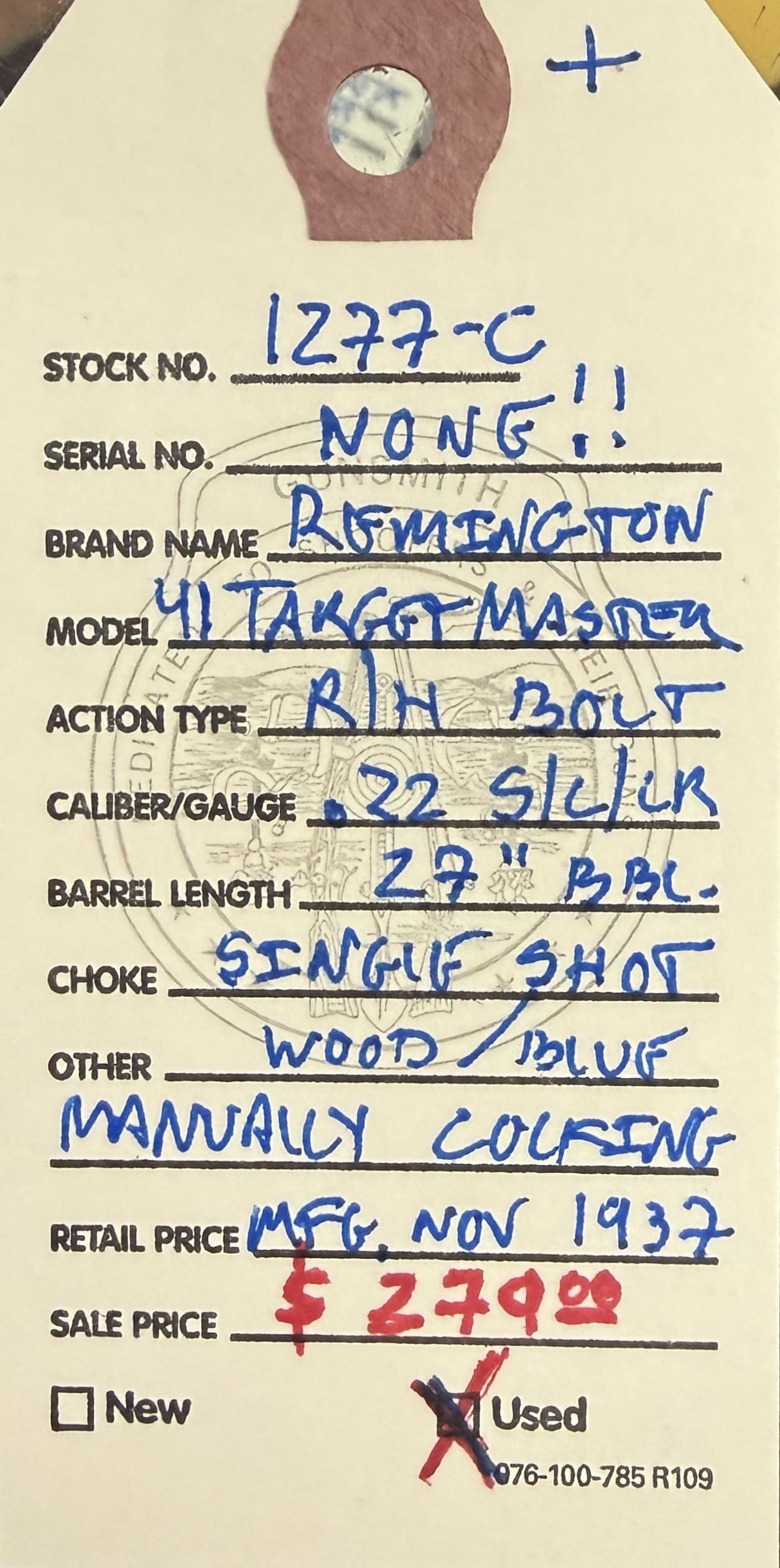 Home / Rifles / Single Shot Rifles / Remington, used, Model 41 Targetmaster, .22 S/L/LR caliber, single shot, right handed, manual cocking, bolt action rifle, 27” barrel, wood/blue, manufactured November 1937. Remington, used, Model 41 Targetmaster, .22 S/L/LR caliber, single shot, right handed, manual cocking, bolt action rifle, 27” barrel, wood/blue, manufactured November 1937.$279.00 Remington, used, Model 41 Targetmaster, .22 S/L/LR caliber, single shot, right handed, manual cocking, bolt action rifle, 27” barrel, wood/blue, manufactured November 1937. quantity Add to cart SKU: 1277-C G/R Category: Single Shot Rifles Tags: .22 S/L/LR caliber, 27” barrel, bolt action rifle, manually cocking rifle ., manufactured November 1937, Model 41 Targetmaster, Remington, right handed, single shot, used Product ID: 21599 Description Description This classic old rifle is available at the NORTHERN LIGHTS STORE. Please call 907-245-5486 for additional information. Related products J P Sauer & Son Drilling 16ga 8 mm R $5,999.00 Add to cart Mossberg patriot 30-06 $499.00 Add to cart SALE!! Remington Rolling Block carbine, 7x57mm Mauser caliber, w/20.5” barrel. $1,349.00 Add to cart Connecticut valley arms Optima 45 cal $299.00 Add to cart