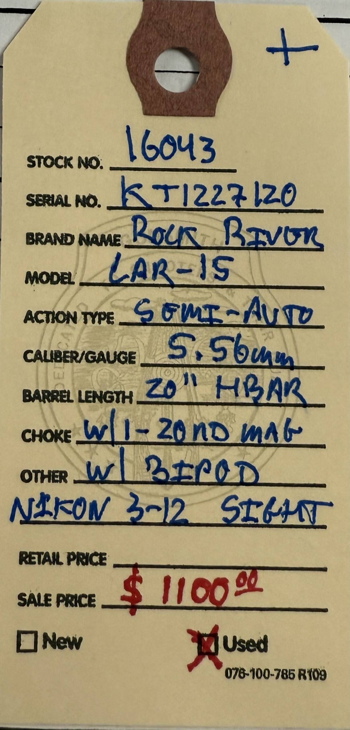 Home / Rifles / Semi Auto Rifles / Rock River Arms, used, LAR-15, semi-auto rifle, 5.56mm caliber, 20” stainless steel extra heavy barrel, bipod, Nikon 3-12 telescopic sight, w/1-20 round magazine. Rock River Arms, used, LAR-15, semi-auto rifle, 5.56mm caliber, 20” stainless steel extra heavy barrel, bipod, Nikon 3-12 telescopic sight, w/1-20 round magazine.$1,100.00 Rock River Arms, used, LAR-15, semi-auto rifle, 5.56mm caliber, 20” stainless steel extra heavy barrel, bipod, Nikon 3-12 telescopic sight, w/1-20 round magazine. quantity Add to cart SKU: 16043 G/R Category: Semi Auto Rifles Tags: 20” stainless steel extra heavy barrel, 5.56mm caliber, bipod, LAR-15, Nikon 3-12 telescopic sight, Rock River Arms, semi-auto rifle, used, w/1-20 round magazine. Product ID: 20382 Description Description This rifle is available at the NORTHERN LIGHTS STORE. Please call 907-276-8105 for additional information. Related products Smith & Wesson, M&P 15/22, .22 LR caliber, semi-auto rifle. $469.00 Add to cart KelTec sub-2000 40sw $500.00 Add to cart CMMG mk4 556 $999.00 Add to cart Russia, used, SKS-45, semi-auto rifle, Russian arsenal refinished, 20” barrel, blade bayonet, laminated stock, original Russian sling, 10 round internal magazine. A beautiful rifle! $1,050.00 Add to cart