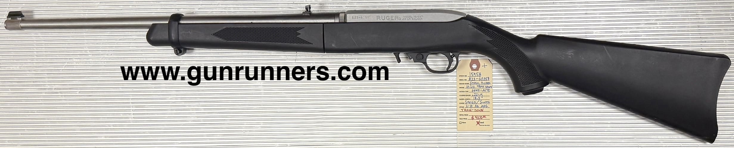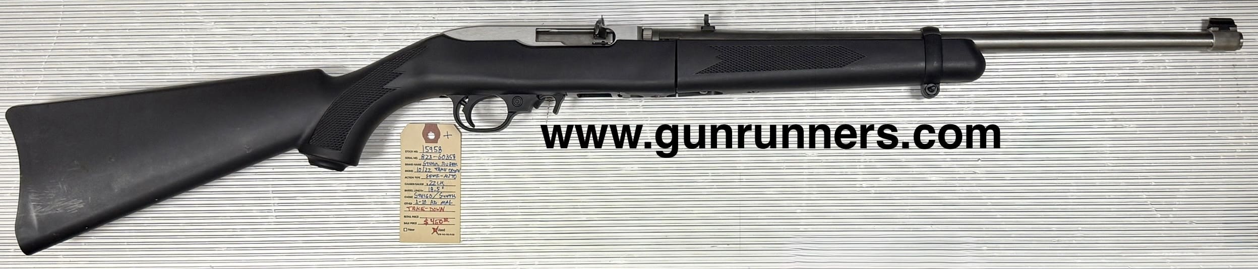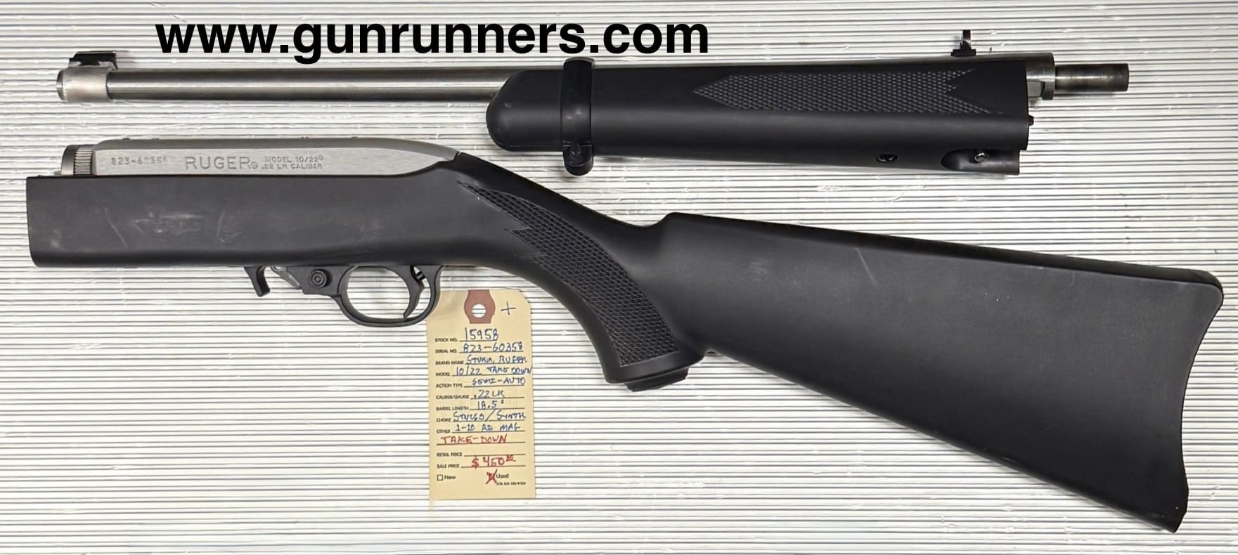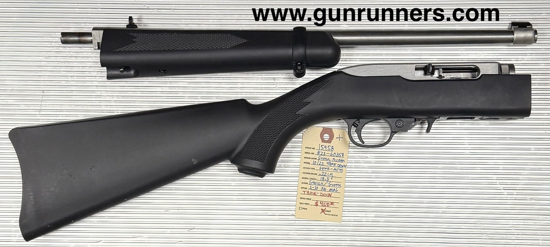 Ruger 10/22 Take-Down, used, semi-auto rifle, 22 LR caliber, 18.5” barrel, stainless/synthetic, quick and easy disassembly, lightweight, in excellent condition.