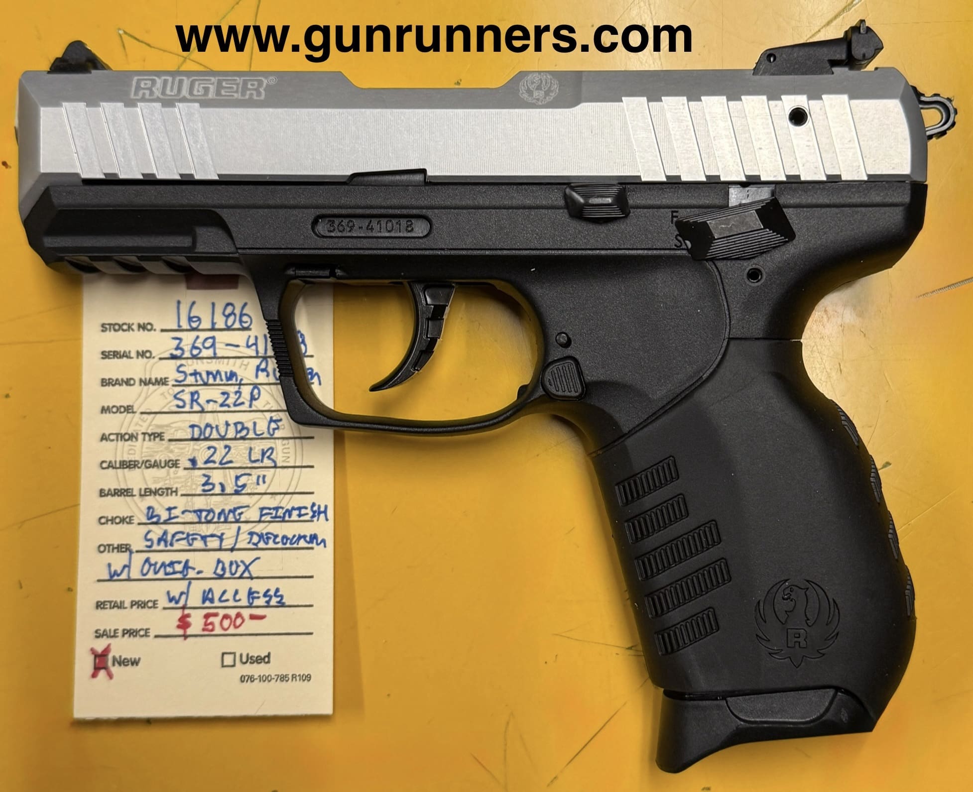 Home / Pistols / Semi Auto Pistols / Ruger, new, SR-22P, .22LR caliber, double action, semi auto pistol, bitone finish, 3.5” barrel, 2-10 round magazines, absolutely new w/box and accessories. Ruger, new, SR-22P, .22LR caliber, double action, semi auto pistol, bitone finish, 3.5” barrel, 2-10 round magazines, absolutely new w/box and accessories.$500.00 Ruger, new, SR-22P, .22LR caliber, double action, semi auto pistol, bitone finish, 3.5” barrel, 2-10 round magazines, absolutely new w/box and accessories. quantity Add to cart SKU: 16186 G/R Category: Semi Auto Pistols Tags: .22LR caliber, 2-10 round magazines, 3.5” barrel, bitone finish, double action, Ruger, safety/decocker, semi auto pistol, SR-22P, w/box and accessories. Product ID: 21075 Description Description This “slim-n-trim” .22LR pistol is absolutely new in box and available at the NORTHERN LIGHTS STORE. Please call 907-276-8105 for additional information. Related products Glock 22 3rd gen 40S&W $499.00 Add to cart Glock 22 gen 4 40S&W $499.00 Add to cart Springfield 1911 compact range officer, light weight 45acp $799.00 Add to cart HK VP9 Optics ready 9 mm $899.00 Add to cart