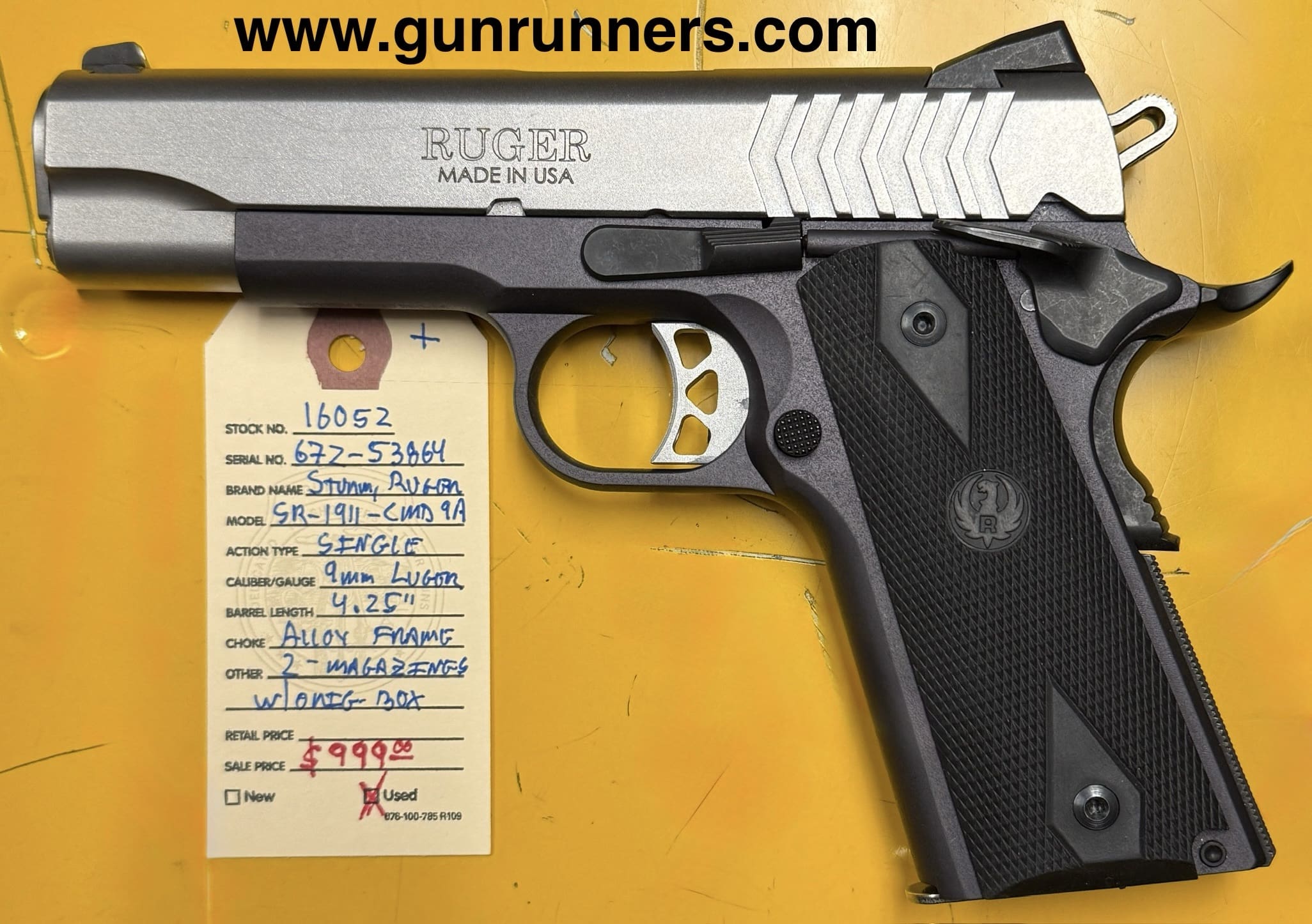 Home / Pistols / Semi Auto Pistols / Ruger, SR-1911-CMD-9A, 9mm Luger caliber, 1911 single action semi auto pistol, 4.25” barrel, light weight alloy frame, bi-tone finish, 2 magazines, new with box and accessories. Ruger, SR-1911-CMD-9A, 9mm Luger caliber, 1911 single action semi auto pistol, 4.25” barrel, light weight alloy frame, bi-tone finish, 2 magazines, new with box and accessories.$999.00 Ruger, SR-1911-CMD-9A, 9mm Luger caliber, 1911 single action semi auto pistol, 4.25” barrel, light weight alloy frame, bi-tone finish, 2 magazines, new with box and accessories. quantity Add to cart SKU: 16052 G/R Category: Semi Auto Pistols Tags: 1911 single action, 2 magazines, 4.25” barell, 9mm Luger caliber, bi-tone finish, light weight alloy frame, new w/box and all accessories., Ruger, semi-auto pistol, SR-1911 - CMD-9A Product ID: 20417 Description Description This beautiful, light weight 1911 is available at the NORTHERN LIGHTS STORE. Please call 907-276-8105 for additional information. Related products Springfield XDME 10 mm $653.00 Add to cart Sig Sauer M17X 9 mm $1,400.00 Add to cart Springfield SA 35 9mm $899.00 Add to cart HK VP9 Optics ready 9 mm $899.00 Add to cart