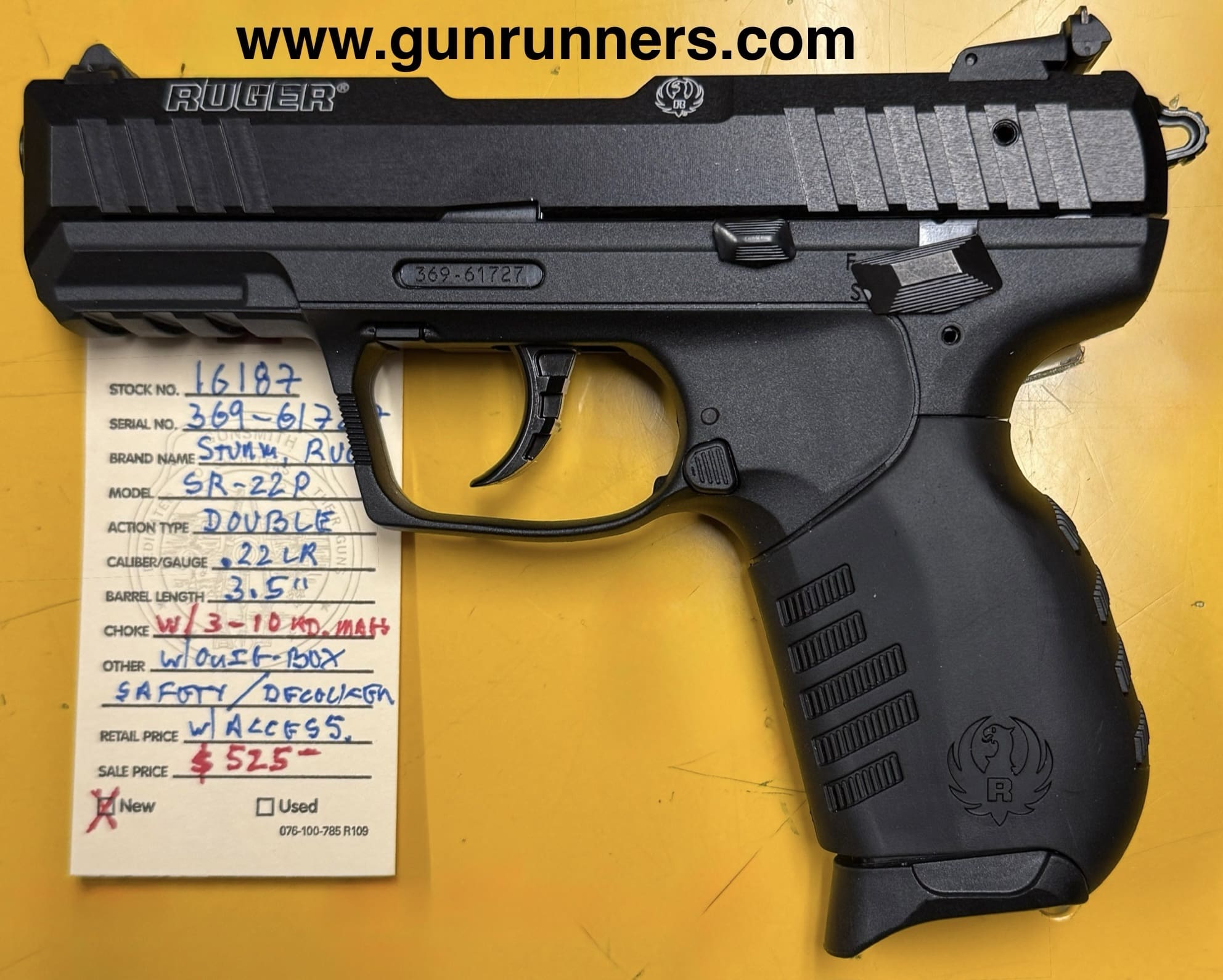 Home / Pistols / Semi Auto Pistols / Ruger, SR-22P, .22LR caliber, double action, semi auto pistol, 3.5” barrel, matte black finish, 3-10 round magazines, safety/decocker, new w/box and accessories. Ruger, SR-22P, .22LR caliber, double action, semi auto pistol, 3.5” barrel, matte black finish, 3-10 round magazines, safety/decocker, new w/box and accessories.$525.00 Ruger, SR-22P, .22LR caliber, double action, semi auto pistol, 3.5” barrel, matte black finish, 3-10 round magazines, safety/decocker, new w/box and accessories. quantity Add to cart SKU: 16187 G/R Category: Semi Auto Pistols Tags: .22LR caliber, 3-10 round magazines, 3.5” barrel, double action, new, Ruger, semi auto pistol, SR-22P, Sturm, w/box and accessories., w/safety and decocker Product ID: 21072 Description Description This “slim-n-trim” .22 pistol is absolutely new in box and available at the NORTHERN LIGHTS STORE. Please call 907-276-8105 for additional information. Related products Colt government model 1911 45acp $1,199.00 Add to cart SALE!! Glock Model 37, .45 GAP caliber, Gen. 3, semi-auto pistol, 4.49” barrel, w/10 round magazine. $599.00 Add to cart Smith and Wesson M&P 40 40S&W $550.00 Add to cart Ruger Max 4 9mm $439.00 Add to cart