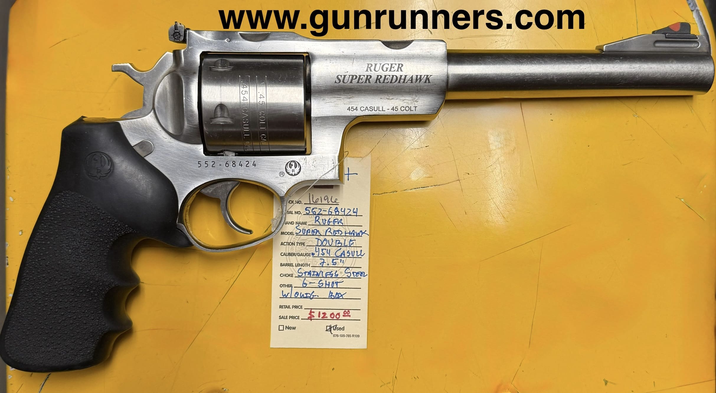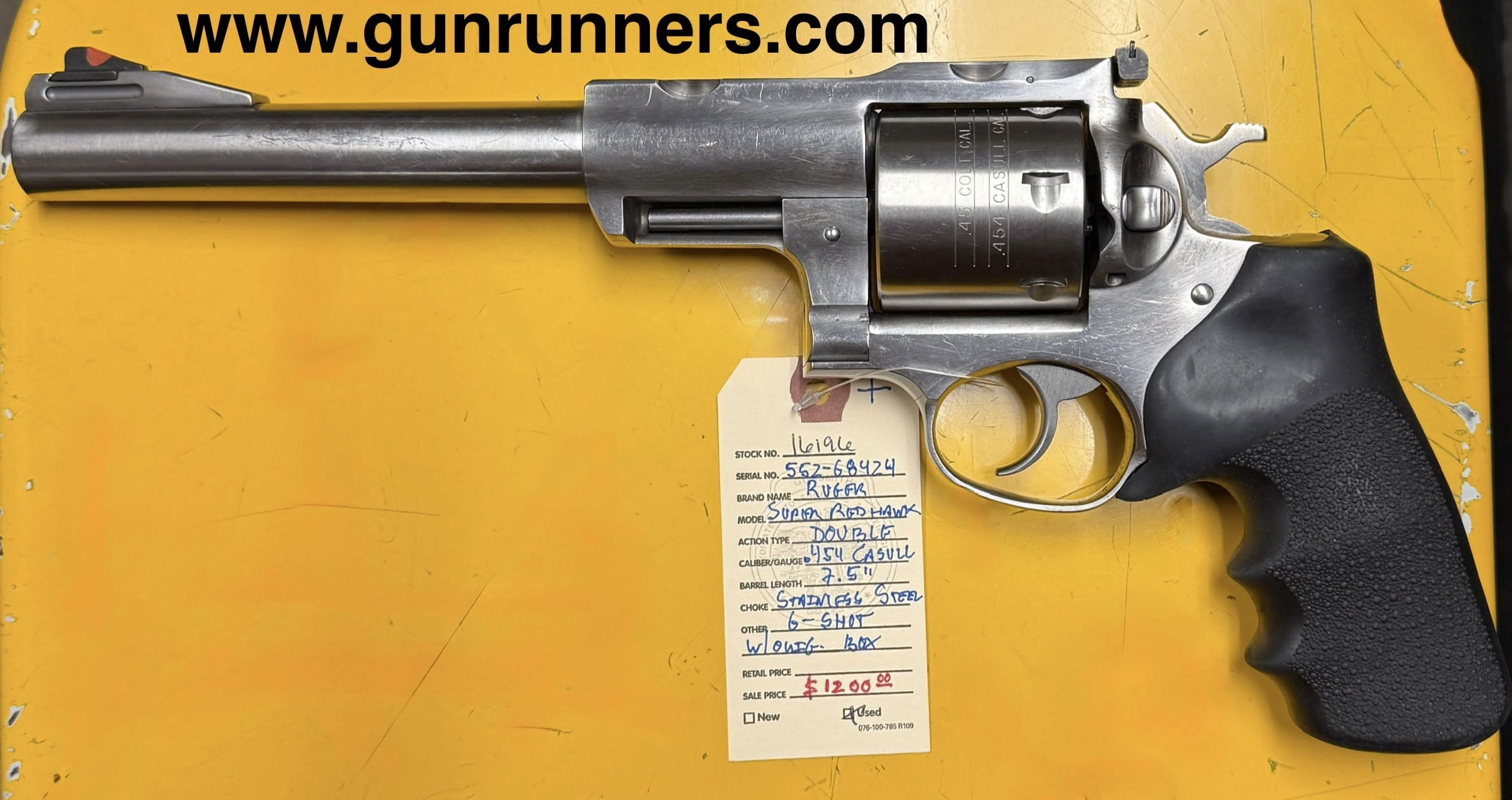 Home / Pistols / Revolvers / Ruger, used, .454 Casull caliber, Super Redhawk, double action revolver, 6-shot, stainless steel, 7.5” barrel, with original box. This revolver is in excellent condition. Ruger, used, .454 Casull caliber, Super Redhawk, double action revolver, 6-shot, stainless steel, 7.5” barrel, with original box. This revolver is in excellent condition.$1,200.00 Ruger, used, .454 Casull caliber, Super Redhawk, double action revolver, 6-shot, stainless steel, 7.5” barrel, with original box. This revolver is in excellent condition. quantity Add to cart SKU: 16196 G/R Category: Revolvers Tags: .454 Casull caliber, 6-shot, 7.5” barrel, double action revolver, Ruger, stainless steel, Super Redhawk, used, w/original box. Product ID: 21172 Description Description This powerful bear blaster is available at the NORTHERN LIGHTS STORE. Please call 907-276-8105 for additional information. Related products Colt Trooper mk lll 357 mag $799.00 Add to cart Smith & Wesson 10-6 38Spl $589.00 Add to cart Ruger Redhawk Alaskan .44 magnum $1,299.00 Add to cart Ruger LCR 357mag $699.00 Add to cart