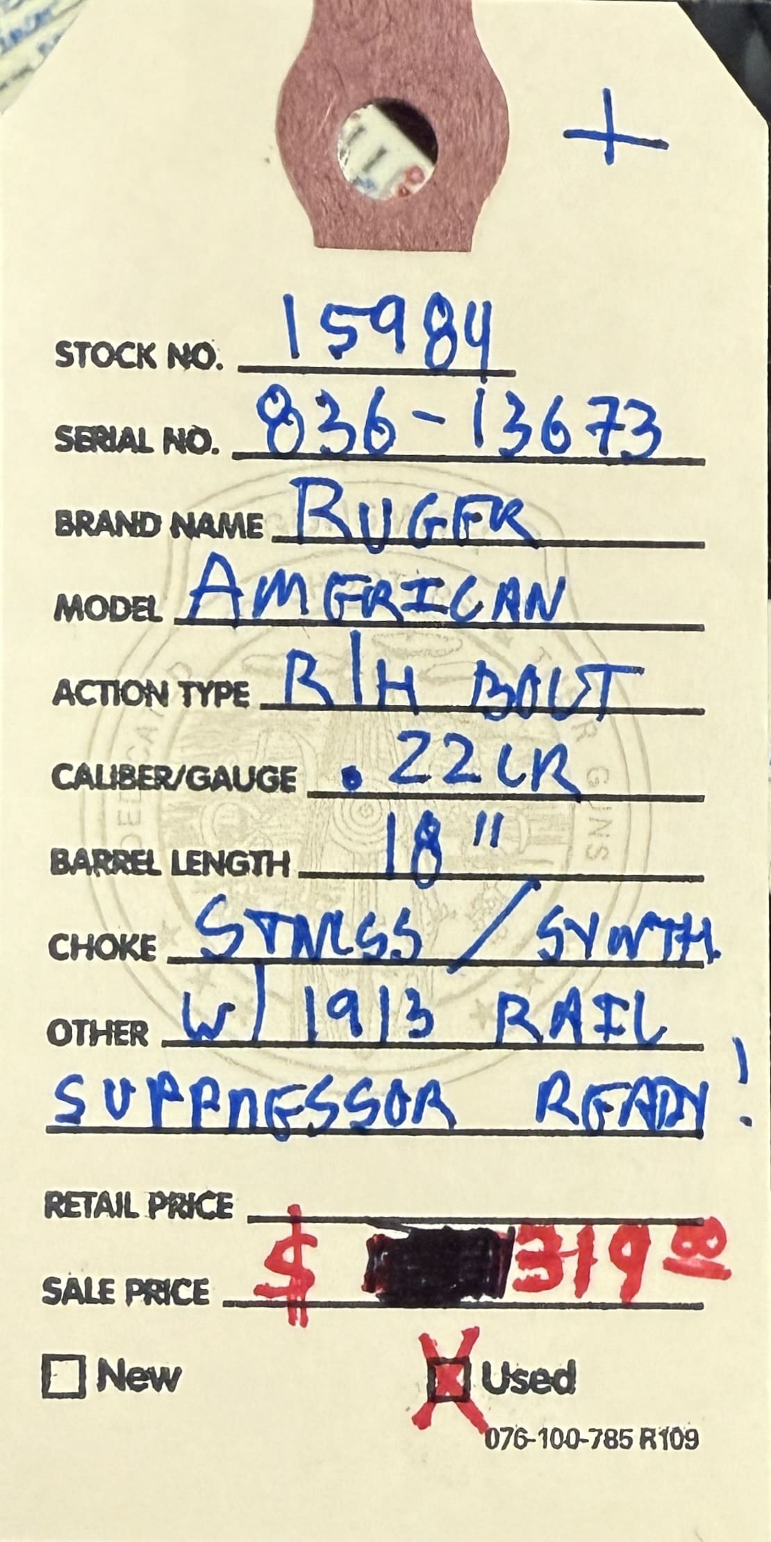 Home / Rifles / Bolt Action Rifles / Ruger, used, American Rimfire, .22 LR caliber, right hand bolt action, stainless steel/synthetic, 18” suppressor ready barrel, 1913 scope rail, w/1-10 round magazine. Ruger, used, American Rimfire, .22 LR caliber, right hand bolt action, stainless steel/synthetic, 18” suppressor ready barrel, 1913 scope rail, w/1-10 round magazine.$319.00 Ruger, used, American Rimfire, .22 LR caliber, right hand bolt action, stainless steel/synthetic, 18” suppressor ready barrel, 1913 scope rail, w/1-10 round magazine. quantity Add to cart SKU: 15984 G/R Category: Bolt Action Rifles Tags: .22LR caliber, 18” suppressor ready barrel, 1913 scope rail, American Rimfire, right hand bolt action, Ruger, stainless steel/synthetic, used, w/1-10 round magazine. Product ID: 20233 Description Description This rifle is available at the NORTHERN LIGHTS STORE. Please call 907-276-8105 for additional information. Related products savage modle 3400 222 Rem $599.00 Add to cart Christiansen Arms model 14, Mesa, 308 wind $1,699.00 Add to cart Ruger, American rimfire 22 mag $459.00 Add to cart Remington 700ADL 3006 $499.00 Add to cart