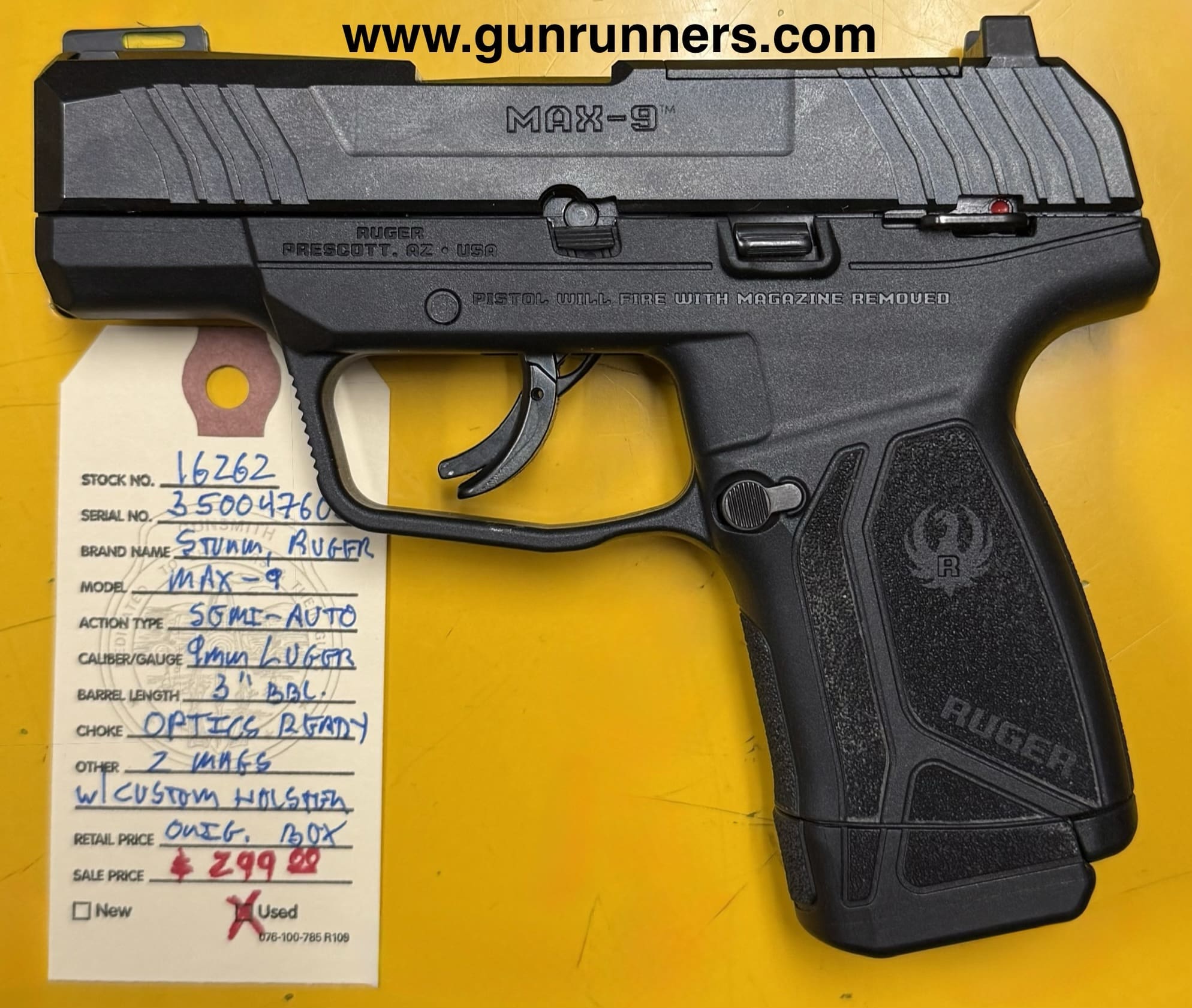 Home / Pistols / Semi Auto Pistols / Ruger, used, Max-9, 9mm Luger caliber, semi auto pistol, 3” barrel, optics ready, 2 magazines, custom holster, with original box. Ruger, used, Max-9, 9mm Luger caliber, semi auto pistol, 3” barrel, optics ready, 2 magazines, custom holster, with original box.$299.00 Ruger, used, Max-9, 9mm Luger caliber, semi auto pistol, 3” barrel, optics ready, 2 magazines, custom holster, with original box. quantity Add to cart SKU: 16262 G/R Category: Semi Auto Pistols Tags: 2 magazines, 3” barrel, 9mm Luger caliber, custom holster, Max-9, optics ready, Ruger, semi auto pistol, used, with original box. Product ID: 21569 Description Description This light weight, compact pistol is available at the NORTHERN LIGHTS STORE. Please call 907-245-5486 for additional information. Related products Smith and Wesson M&P 40 40S&W $550.00 Add to cart Springfield SA 35 9mm $899.00 Add to cart Springfield Armory, new, Echelon, 9mm Luger caliber, semi auto pistol, 4.5” compensated barrel, tritium front sight, 4-17 round magazines, Crimson Trace red dot sight, nylon range bag, with box and all accessories. $850.00 Add to cart Springfield XDME 10 mm $653.00 Add to cart