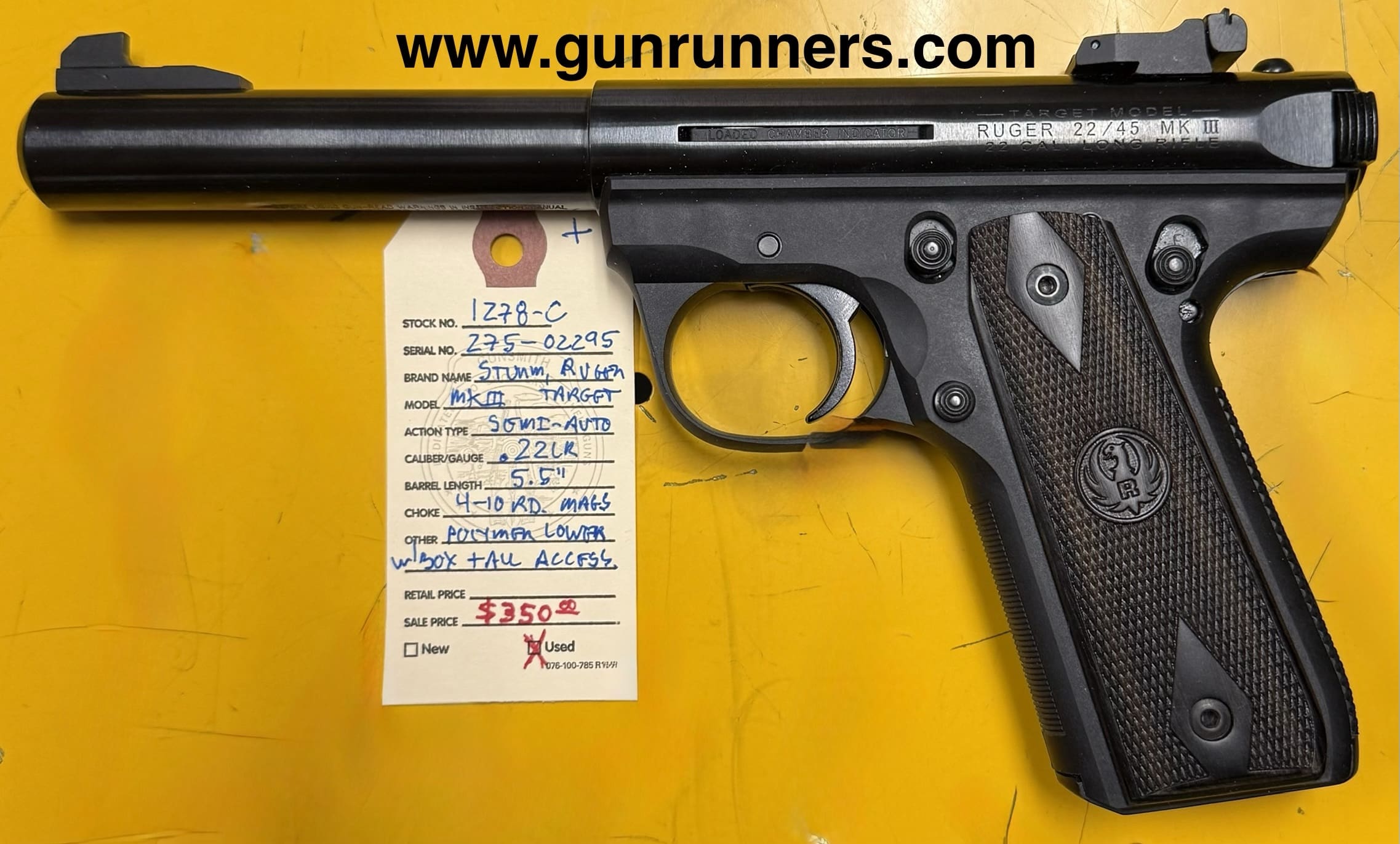 Home / Pistols / Semi Auto Pistols / Ruger, used, MKIII Target, .22LR caliber, semi auto pistol, 4-10 round magazines, adjustable sights, 5.5” bull barrel, blue finish with lightweight polymer lower, original box, with manual and all accessories. This pistol is like new! Ruger, used, MKIII Target, .22LR caliber, semi auto pistol, 4-10 round magazines, adjustable sights, 5.5” bull barrel, blue finish with lightweight polymer lower, original box, with manual and all accessories. This pistol is like new!$350.00 Ruger, used, MKIII Target, .22LR caliber, semi auto pistol, 4-10 round magazines, adjustable sights, 5.5” bull barrel, blue finish with lightweight polymer lower, original box, with manual and all accessories. This pistol is like new! quantity Add to cart SKU: 1278-C G/R Category: Semi Auto Pistols Tags: .22LR caliber, 4-10 round magazines, 5.5” blued bull barrel, lightweight polymer lower, MKIII Target, Ruger, semi auto pistol, used Product ID: 21641 Description Description This quality pistol is available at the NORTHERN LIGHTS STORE. Please call 907-245-5486 for additional information. Related products Sig Sauer M17X 9 mm $1,400.00 Add to cart SALE!! Glock Model 37, .45 GAP caliber, Gen. 3, semi-auto pistol, 4.49” barrel, w/10 round magazine. $599.00 Add to cart Hi Point C9 9 mm $229.00 Add to cart HK VP 40 40 S&W $700.00 Add to cart