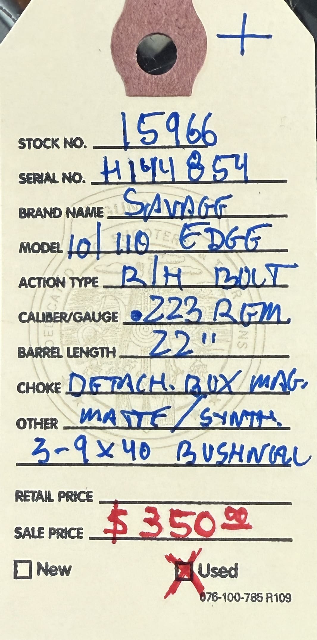 Home / Rifles / Bolt Action Rifles / Savage, used, Model 10/110 Edge, .223 caliber, right hand bolt-action, 22” barrel, detachable box magazine, matte blue/synthetic, Bushnell 3-9X40mm telescopic sight, in excellent condition. Savage, used, Model 10/110 Edge, .223 caliber, right hand bolt-action, 22” barrel, detachable box magazine, matte blue/synthetic, Bushnell 3-9X40mm telescopic sight, in excellent condition.$350.00 Savage, used, Model 10/110 Edge, .223 caliber, right hand bolt-action, 22” barrel, detachable box magazine, matte blue/synthetic, Bushnell 3-9X40mm telescopic sight, in excellent condition. quantity Add to cart SKU: 15966 G/R Category: Bolt Action Rifles Tags: .223 caliber, 22” barrel, Bushnell 3-9X40mm telescopic sight., detachable box magazine, matte blue/synthetic, Model 10/110 Edge, right hand bolt-action rifle, Savage, used Product ID: 20166 Description Description This rifle is available at the NORTHERN LIGHTS STORE. Please call 907-276-8105 for additional information. Related products Ruger, American 6.5 CM with scope $849.00 Add to cart ruger, American 3006 $499.00 Add to cart Swiss, 1878 Vertille 11.3 mm $699.00 Add to cart Remington 700ADL 3006 $499.00 Add to cart