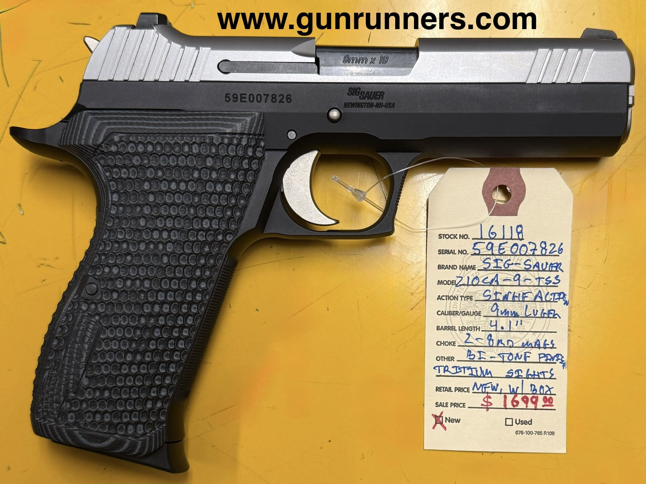Home / Pistols / Semi Auto Pistols / SIG-Sauer, new, P210CA-9-TSS, 9mm Luger caliber, 4.1” barrel, single action, semi auto pistol, bitone finish, manual safety, tritium sights, 2-8 round magazines, absolutely new w/box and all accessories. SIG-Sauer, new, P210CA-9-TSS, 9mm Luger caliber, 4.1” barrel, single action, semi auto pistol, bitone finish, manual safety, tritium sights, 2-8 round magazines, absolutely new w/box and all accessories.$1,699.00 SIG-Sauer, new, P210CA-9-TSS, 9mm Luger caliber, 4.1” barrel, single action, semi auto pistol, bitone finish, manual safety, tritium sights, 2-8 round magazines, absolutely new w/box and all accessories. quantity Add to cart SKU: 16118 G/R Category: Semi Auto Pistols Tags: 2-8 round magazines, 4.1” barrel, 9mm Luger caliber, bitone finish, new, new w/box and all accessories., P210CA-9-TSS, semi auto pistol, SIG-Sauer, single action, thumb safety, tritium sights Product ID: 21078 Description Description This limited production pistol is new in box and available at the NORTHERN LIGHTS STORE. Please call 907-276-8105 for additional information. Related products Glock 23 GEN three with night sights 40S&w Read more Hi Point C9 9 mm $229.00 Add to cart Smith and Wesson M&P 40 40S&W $550.00 Add to cart Glock 20 alpha wolf barrel 10 mm $150.00 Add to cart