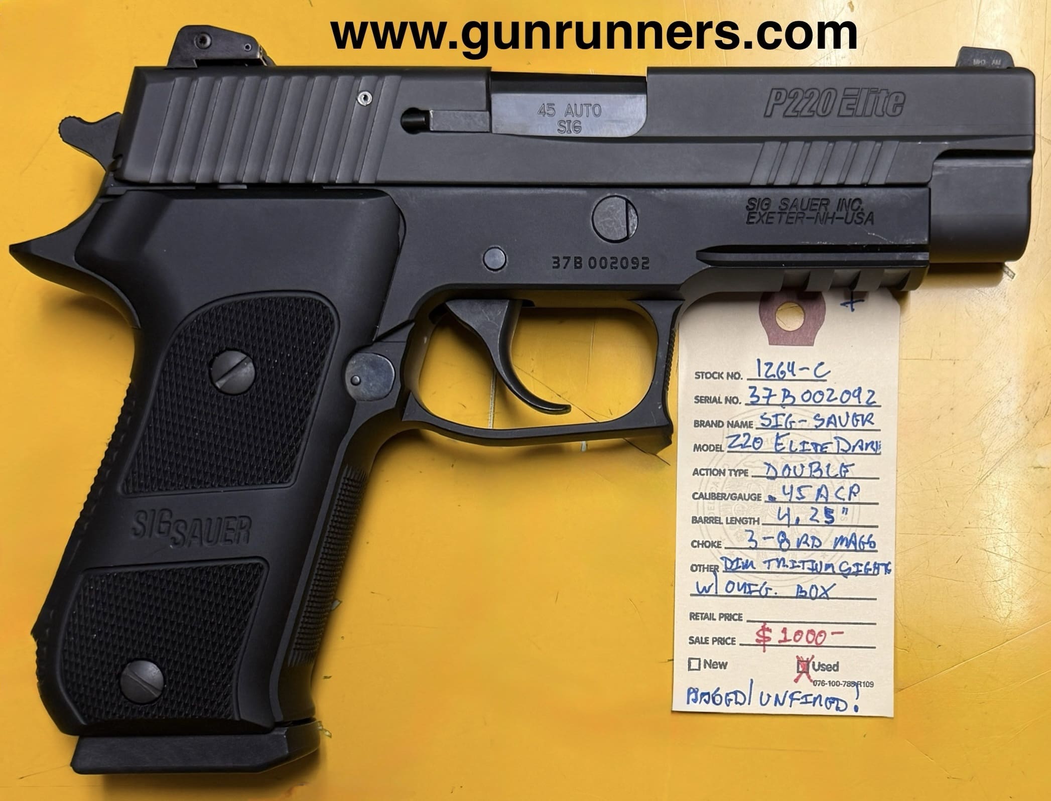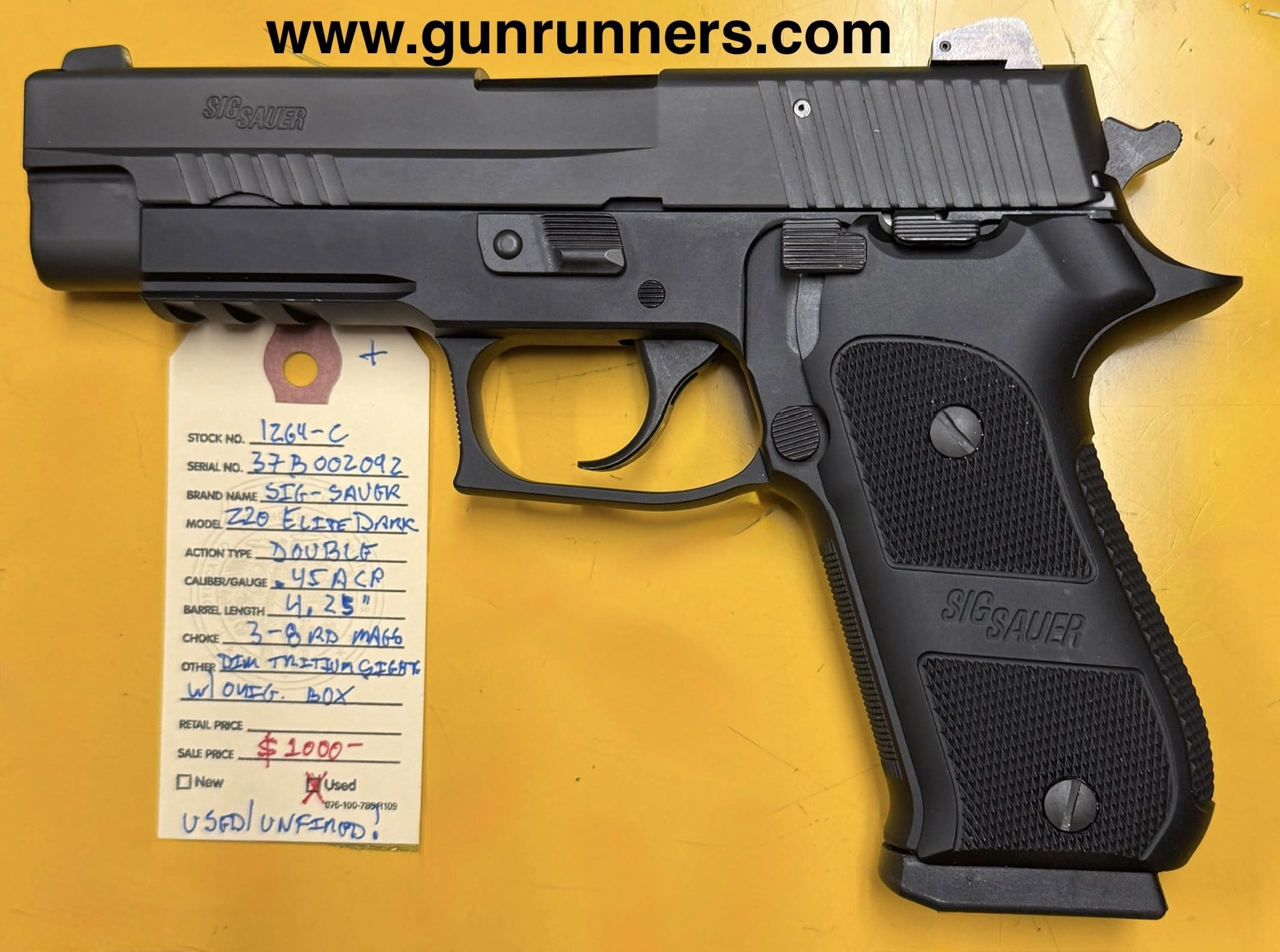 Home / Pistols / Semi Auto Pistols / SIG-Sauer, used/unfired, P-220 Elite Dark, .45ACP caliber, 4.25” barrel, double action semi auto pistol, dim tritium sights, 3-8 round magazines, w/original box and accessories. A very uncommon model. SIG-Sauer, used/unfired, P-220 Elite Dark, .45ACP caliber, 4.25” barrel, double action semi auto pistol, dim tritium sights, 3-8 round magazines, w/original box and accessories. A very uncommon model.$1,000.00 SIG-Sauer, used/unfired, P-220 Elite Dark, .45ACP caliber, 4.25” barrel, double action semi auto pistol, dim tritium sights, 3-8 round magazines, w/original box and accessories. A very uncommon model. quantity Add to cart SKU: 1264-C G/R Category: Semi Auto Pistols Tags: .45ACP caliber, 3-8 round magazines, 4.25” barrel, dim tritium sights, double action semi auto pistol, P-220 Elite Dark, SIG-Sauer, used/unfired, w/or and accessories. Uncommon model. Product ID: 20573 Description Description This beautiful and uncommon pistol is available at the NORTHERN LIGHTS STORE. Please call 907-276-8105 for additional information. Related products Remington 1911R1 45acp $799.00 Add to cart Smith and Wesson M&P 40 40S&W $550.00 Add to cart Kimber Classic custom 45acp $699.00 Add to cart Glock 21 Gen 4 45 acp with nite sights $650.00 Add to cart