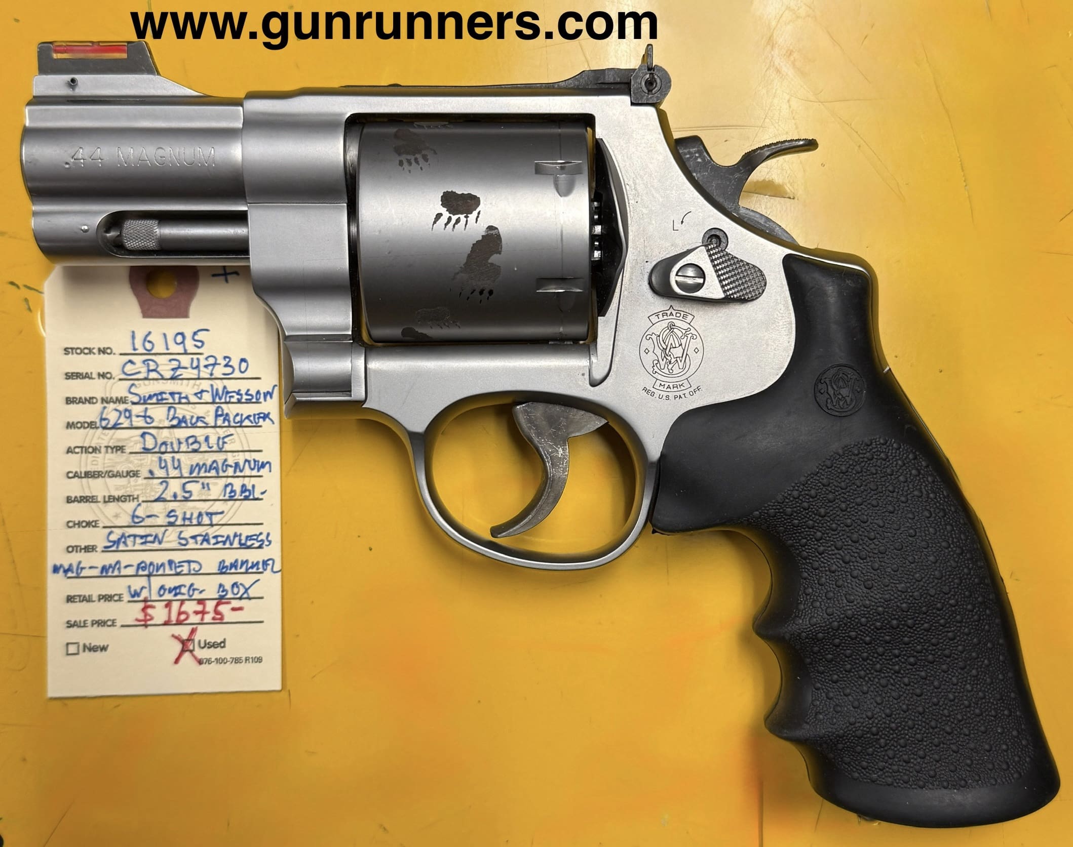 Home / Pistols / Revolvers / Smith and Wesson, used, Model 629-6 AK Backpacker, .44 Magnum caliber, double action revolver, satin stainless steel finish, unfluted cylinder, 2.5” Mag-Na-Ported barrel, w/original box. This revolver is in excellent condition. Smith and Wesson, used, Model 629-6 AK Backpacker, .44 Magnum caliber, double action revolver, satin stainless steel finish, unfluted cylinder, 2.5” Mag-Na-Ported barrel, w/original box. This revolver is in excellent condition.$1,675.00 Smith and Wesson, used, Model 629-6 AK Backpacker, .44 Magnum caliber, double action revolver, satin stainless steel finish, unfluted cylinder, 2.5” Mag-Na-Ported barrel, w/original box. This revolver is in excellent condition. quantity Add to cart SKU: 16195 G/R Category: Revolvers Tags: .44 Magnum caliber, 2.5” Mag-Na-Ported barrel, 6-shot, double action revolver, Model 629-6 AK Backpacker, satin stainless steel, Smith and Wesson, unfluted cylinder, used, w/original box. Product ID: 21167 Description Description This beautiful “Bear Blaster” is available at the NORTHERN LIGHTS STORE. Please call 907-276-8105 for additional information. Related products Smith & Wesson 19-3 Texas Rangers 357 magnum $2,500.00 Add to cart Ruger GP100 357mag $899.00 Add to cart Ruger Redhawk Alaskan .44 magnum $1,299.00 Add to cart Ruger black hawk 44 mag $499.00 Add to cart