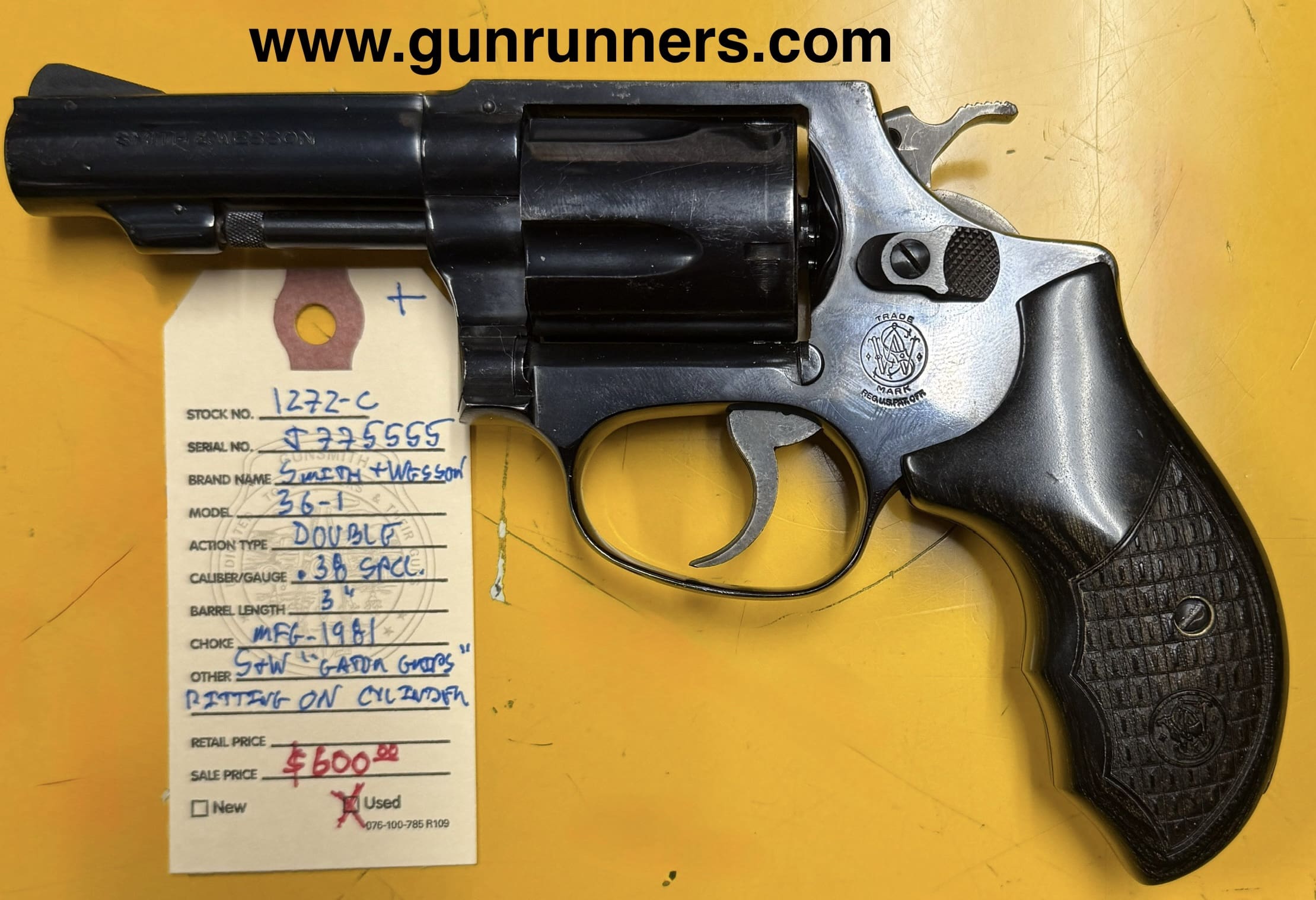 Home / Pistols / Revolvers / Smith & Wesson, used, Model 36-1, .38 Special caliber, double action revolver, blued finish, uncommon 3” barrel, 5 shot, S&W “gator grips”, manufactured 1981, with light pitting on cylinder. Smith & Wesson, used, Model 36-1, .38 Special caliber, double action revolver, blued finish, uncommon 3” barrel, 5 shot, S&W “gator grips”, manufactured 1981, with light pitting on cylinder.$600.00 Smith & Wesson, used, Model 36-1, .38 Special caliber, double action revolver, blued finish, uncommon 3” barrel, 5 shot, S&W “gator grips”, manufactured 1981, with light pitting on cylinder. quantity Add to cart SKU: 1272-C G/R Category: Revolvers Tags: .38 Special caliber, 3” barrel, blued finish, double action revolver, light pitting on cylinder., manufactured 1981, Model 36-1, used Product ID: 21459 Description Description This uncommon revolver is available at the NORTHERN LIGHTS STORE. Please call 907-276-8105 for additional information. Related products Taurus Judge, .45 Colt/.410gs, 3” barrel, used/excellent, w/box. $569.00 Add to cart Colt Python 357 mag $1,499.00 Add to cart Taurus 94 22lr Read more Smith & Wesson 64-8 38Spl $619.00 Add to cart