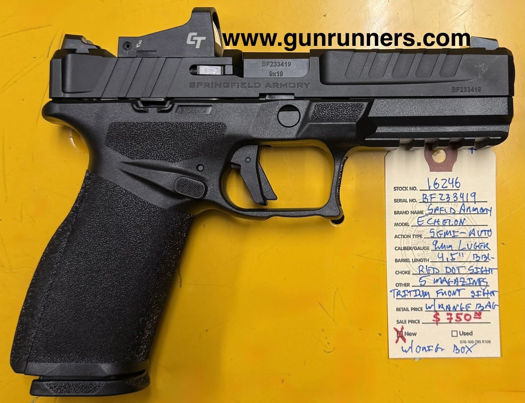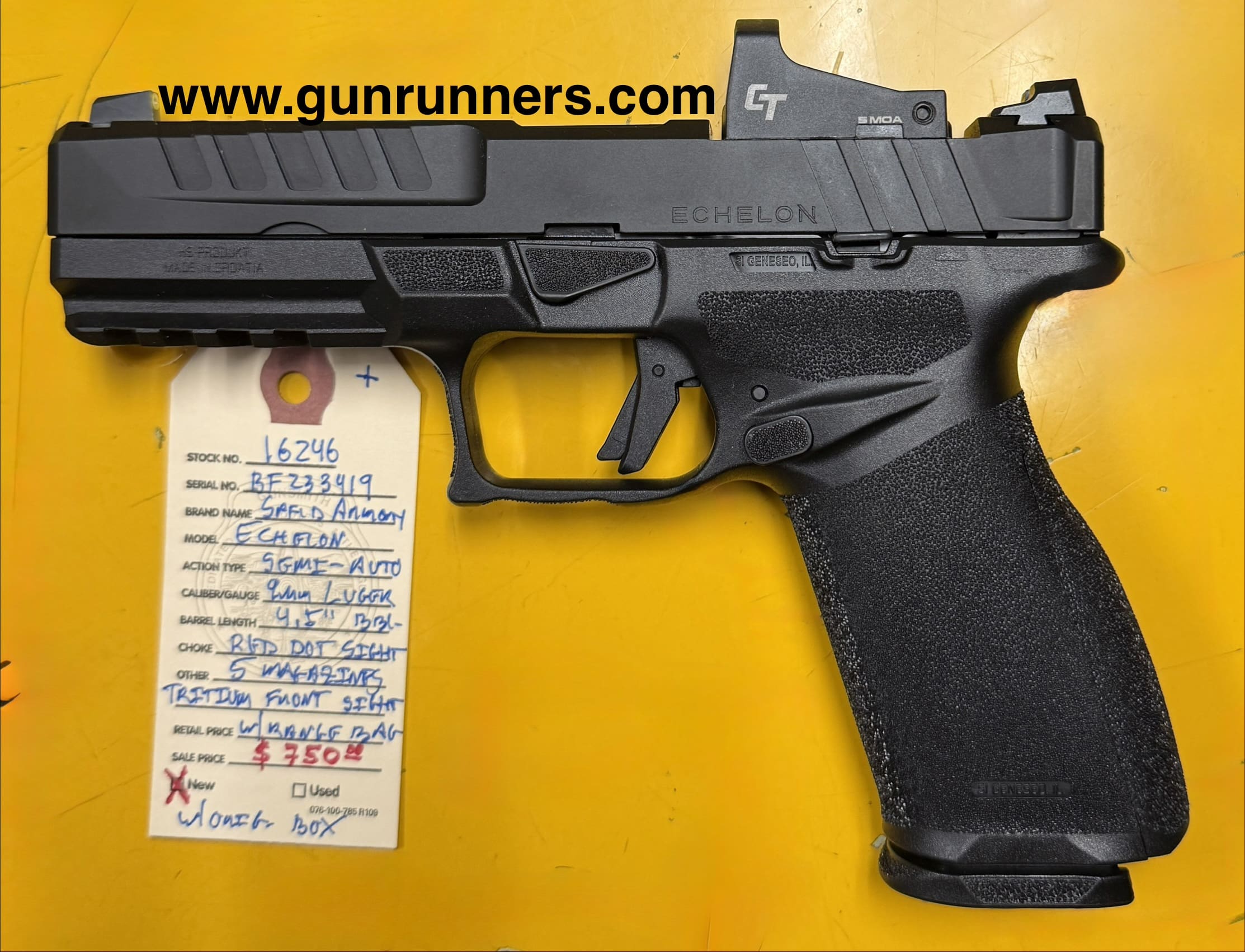 Home / Pistols / Semi Auto Pistols / Springfield Armory, new, Echelon, 9mm Luger caliber, semi auto pistol, 4.5” barrel, Crimson Trace red dot sight, 5-17 round magazines, tritium front sight, range bag, new with box and accessories. Springfield Armory, new, Echelon, 9mm Luger caliber, semi auto pistol, 4.5” barrel, Crimson Trace red dot sight, 5-17 round magazines, tritium front sight, range bag, new with box and accessories.$750.00 Springfield Armory, new, Echelon, 9mm Luger caliber, semi auto pistol, 4.5” barrel, Crimson Trace red dot sight, 5-17 round magazines, tritium front sight, range bag, new with box and accessories. quantity Add to cart SKU: 16246 G/R Category: Semi Auto Pistols Tags: 4.5” barrel, 5-17 round magazines, 9mm Luger caliber, Crimson Trace red dot sight, Echelon, new, range bag, semi auto pistol, Springfield Armory, tritium front sight, with box and all accessories. Product ID: 21566 Description Description This wonderful pistol is available at the NORTHERN LIGHTS STORE. Please call 907-245-5486 for additional information. Related products HK VP9 Optics ready 9 mm $899.00 Add to cart Glock 22 gen 4 40S&W $499.00 Add to cart HK VP 40 40 S&W $700.00 Add to cart Springfield SA 35 9mm $899.00 Add to cart