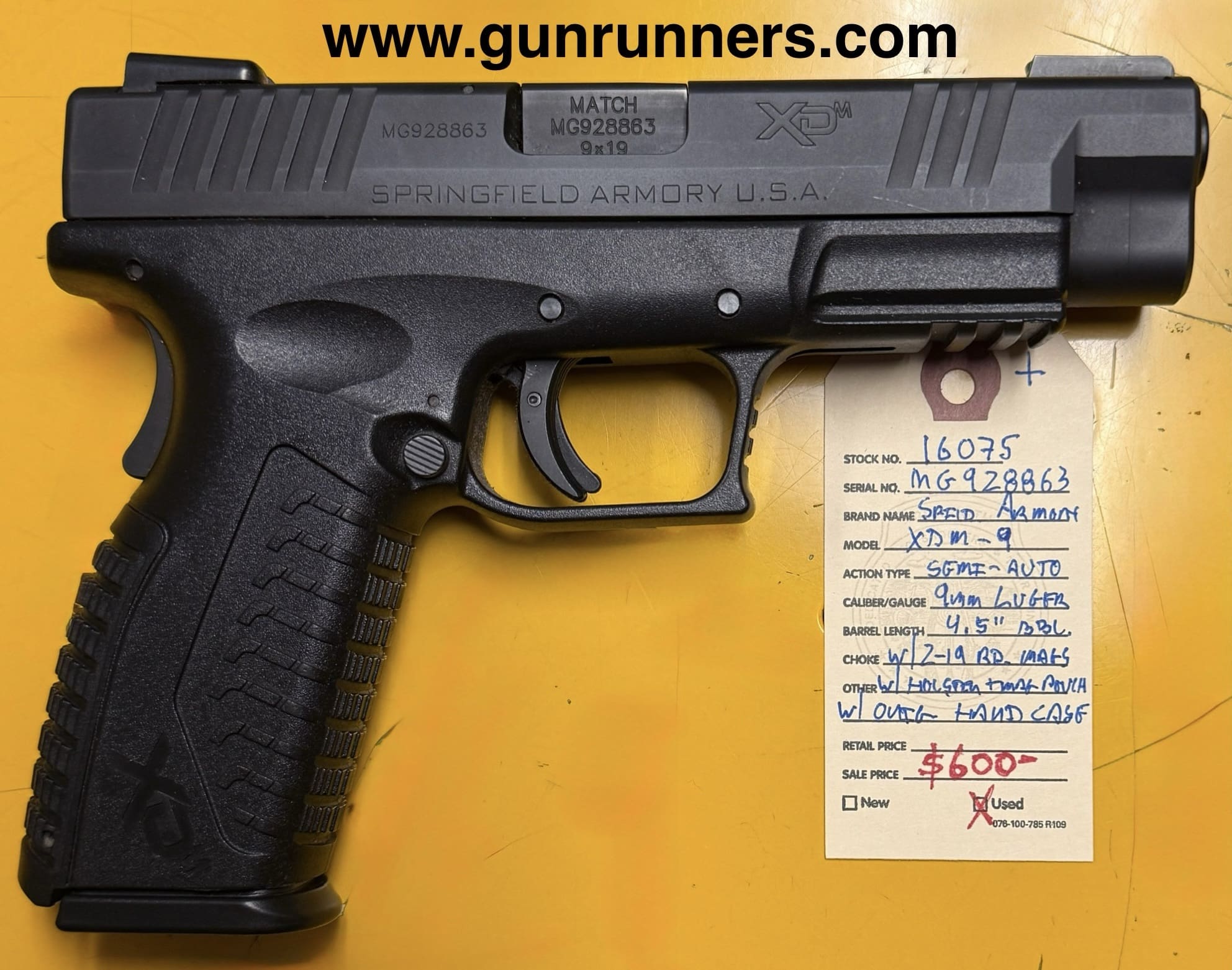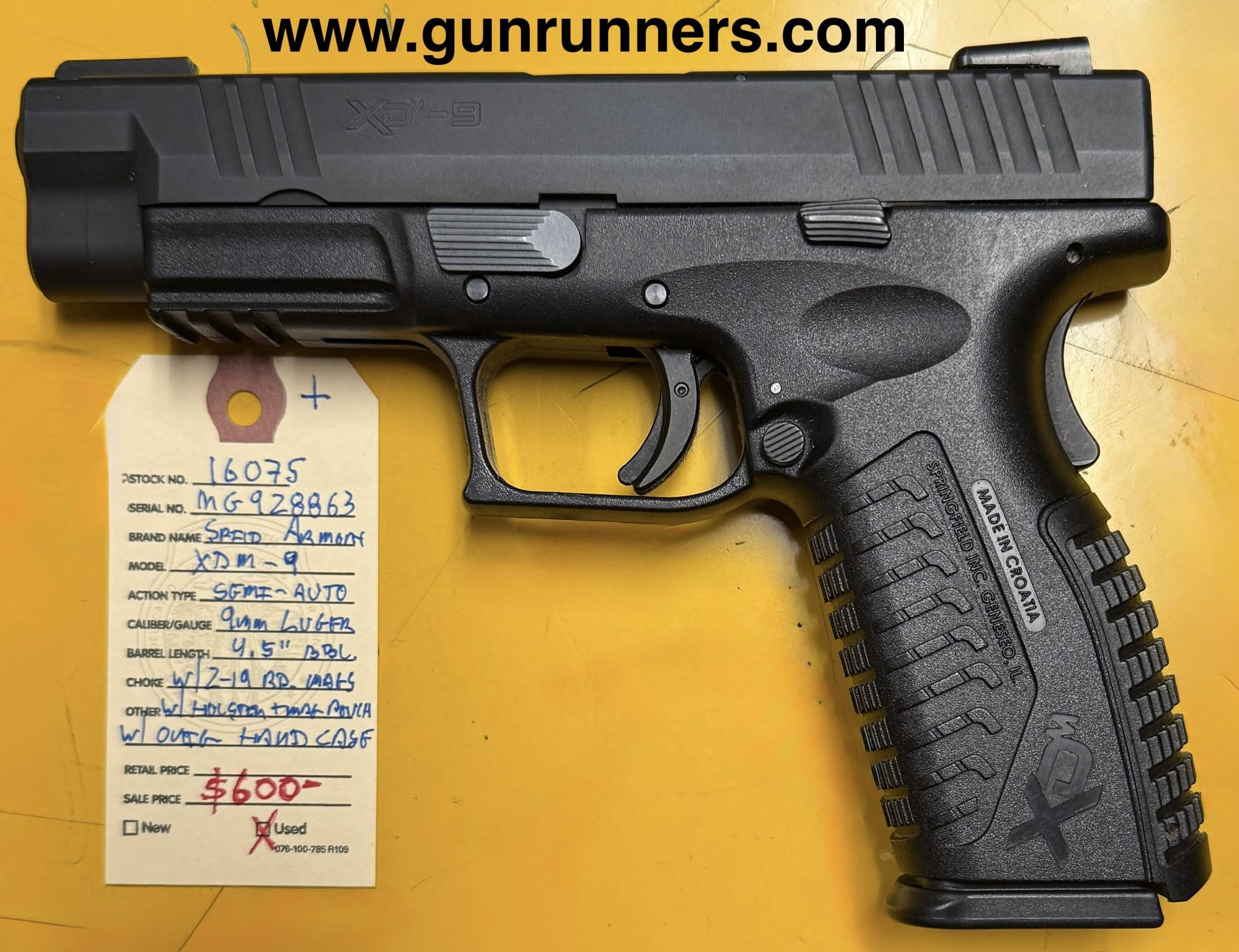Home / Pistols / Semi Auto Pistols / Springfield Armory, used, XDM-9, 9mm Luger caliber, striker fired semi auto pistol, 2-19 round magazines, original hard case, w/holster & magazine pouch. This pistol is in superb condition. Springfield Armory, used, XDM-9, 9mm Luger caliber, striker fired semi auto pistol, 2-19 round magazines, original hard case, w/holster & magazine pouch. This pistol is in superb condition.$600.00 Springfield Armory, used, XDM-9, 9mm Luger caliber, striker fired semi auto pistol, 2-19 round magazines, original hard case, w/holster & magazine pouch. This pistol is in superb condition. quantity Add to cart SKU: 16075 G/R Category: Semi Auto Pistols Tags: 2-19 round magazines, 4.5” barrel, 9mm Luger caliber, and magazine pouches., holster, original hard case, semi auto pistol, Springfield Armory, striker fired, used, XDM-9 Product ID: 20579 Description Description This full sized, quality pistol is available at the NORTHERN LIGHTS STORE. Please call 907-276-8105 for additional information. Related products Taurus 709 slim 9mm $299.00 Add to cart Kimber Classic custom 45acp $699.00 Add to cart SIG-Sauer, used/unfired, P-220 Elite Dark, .45ACP caliber, 4.25” barrel, double action semi auto pistol, dim tritium sights, 3-8 round magazines, w/original box and accessories. A very uncommon model. $1,000.00 Add to cart Colt Series 80 1911 45acp $899.00 Add to cart