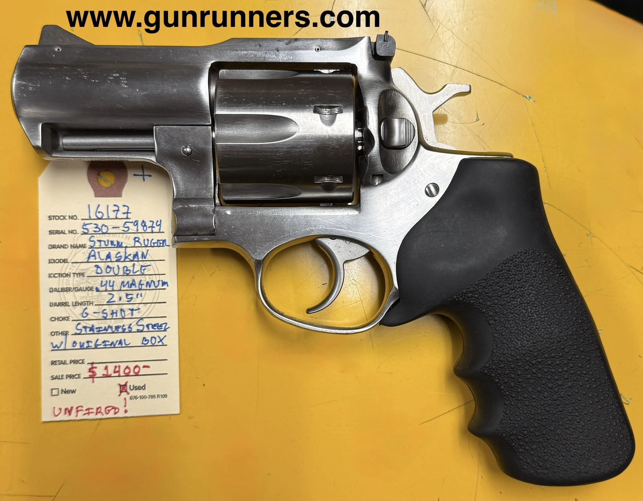 Home / Pistols / Revolvers / Sturm, Ruger, & Co., used, Super RedHawk “Alaskan”, .44 Magnum caliber, 6-shot, 2.5” barrel, stainless steel, double action revolver, w/original box. This revolver has very minor surface wear, but is unfired and in excellent condition. Sturm, Ruger, & Co., used, Super RedHawk “Alaskan”, .44 Magnum caliber, 6-shot, 2.5” barrel, stainless steel, double action revolver, w/original box. This revolver has very minor surface wear, but is unfired and in excellent condition.$1,400.00 Sturm, Ruger, & Co., used, Super RedHawk “Alaskan”, .44 Magnum caliber, 6-shot, 2.5” barrel, stainless steel, double action revolver, w/original box. This revolver has very minor surface wear, but is unfired and in excellent condition. quantity Add to cart SKU: 16177 G/R Category: Revolvers Tags: .44 Magnum caliber, 2.5” barrel, 6-shot, double action revolver, Ruger, stainless steel, Super Redhawk “Alaskan”, used, w/original box. Product ID: 21022 Description Description This superb bear gun is available at the NORTHERN LIGHTS STORE. Please call 907-276-8105 for additional information. Related products Smith & Wesson, Model 617-6, 10-shot, .22LR caliber, double action revolver, w/4” barrel. New, with box & accessories. $979.00 Add to cart Ruger black hawk 44 mag $499.00 Add to cart Colt python 357 mag $1,550.00 Add to cart Ruger Super Redhawk, used, .44 Magnum caliber, stainless steel, double-action revolver, 7.5” barrel, 1” scope rings, with original box and manual. Used/excellent condition. $1,150.00 Add to cart