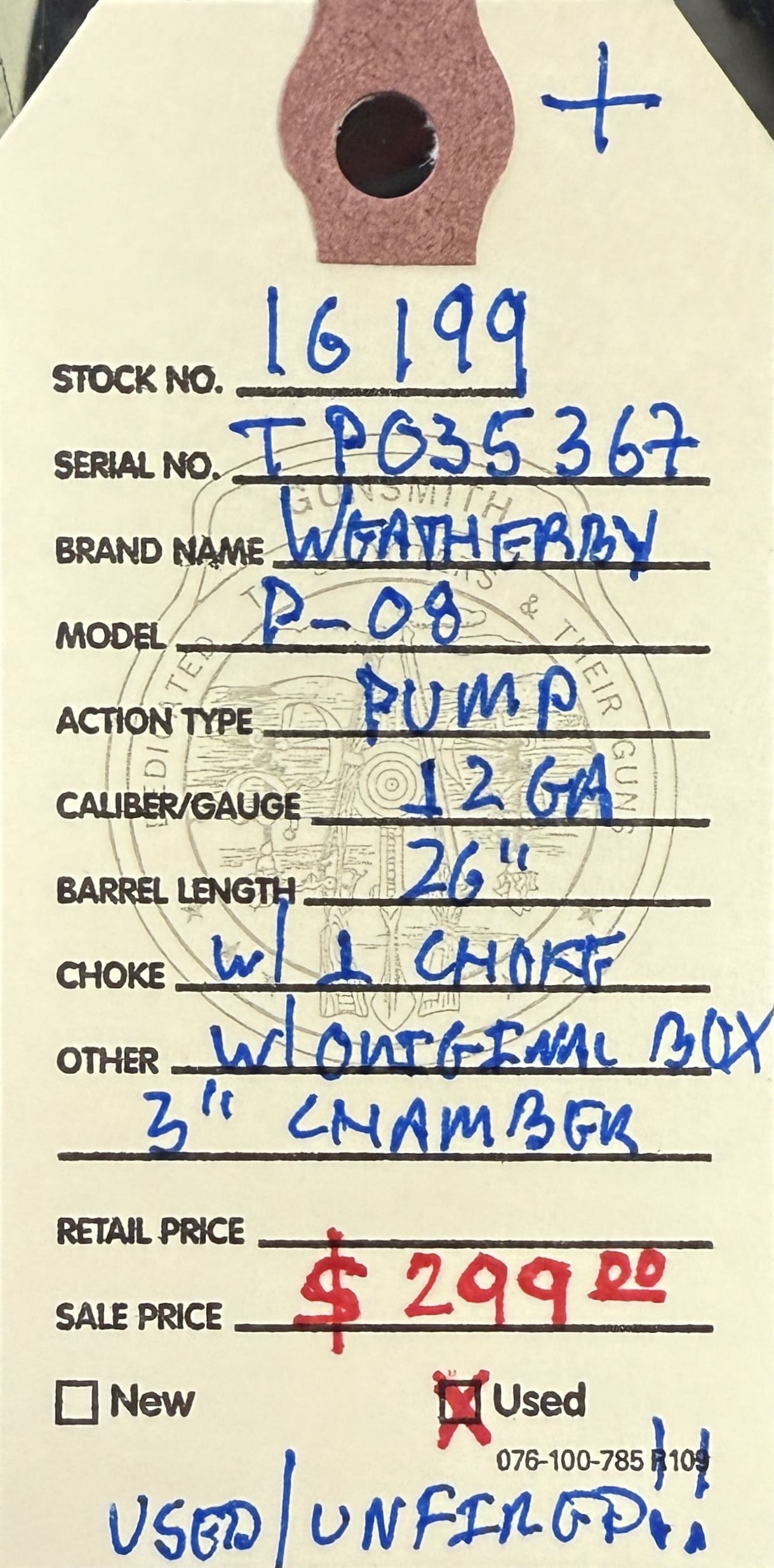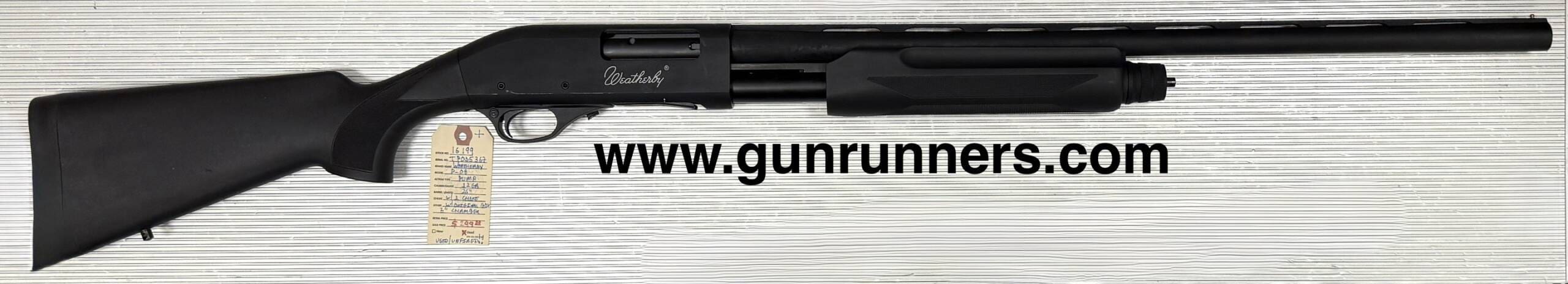 Home / Shotguns / Pump Action Shotguns / Weatherby, used/unfired, PA-08, 12 gauge, 26” barrel, 3” chamber, pump action shotgun, matte black finish, synthetic furniture, with original box. This shotgun is used/unfired in new condition. Weatherby, used/unfired, PA-08, 12 gauge, 26” barrel, 3” chamber, pump action shotgun, matte black finish, synthetic furniture, with original box. This shotgun is used/unfired in new condition.$299.00 Weatherby, used/unfired, PA-08, 12 gauge, 26” barrel, 3” chamber, pump action shotgun, matte black finish, synthetic furniture, with original box. This shotgun is used/unfired in new condition. quantity Add to cart SKU: 16199 G/R Category: Pump Action Shotguns Tags: 12 gauge, 26” barrel, 3” chamber, matte black finish with synthetic furniture, original box., PA-08, pump action shotgun, used/unfired, Weatherby Product ID: 21209 Description Description This shotgun is available at the NORTHERN LIGHTS STORE. Please call 907-276-8105 for additional information. Related products Winchester Model 12 12ga $699.00 Add to cart Mossberg shockwave 12ga $725.00 Add to cart Mossberg maverick, 88 12ga $369.00 Add to cart Wetherby Patrician 12ga $350.00 Add to cart